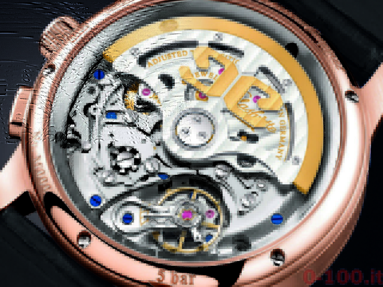 Il calibro, visibile attraverso il fondello in zaffiro, è alloggiato in una cassa in platino con telaio finemente scanalato (42 mm di diametro e 7 mm di spessore) disponibile anche in oro rosa (Ref. 5377BR/12/9WU).