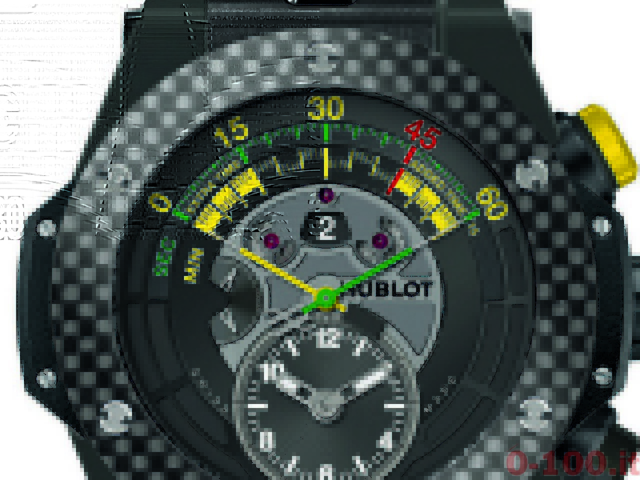 Al centro, due lancette cronografiche misurano, rispettivamente, i secondi (colore bianco) o il centesimo di secondo (colore verde o giallo). Quest’ultima lancetta utilizza la scala riportata sulla parte più esterna del quadrante.