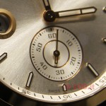 Sul quadrante, argenté opalino con decorazione guilloché verticale al centro, si anima una scenografia ingegnosamente orchestrata da giochi di rastrello, pignone e ruotismi.