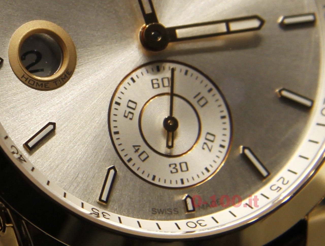 Offre le funzioni ore, minuti, secondi (in un sub quadrante alle 6), regolazione veloce brevettata del secondo fuso orario alle ore 9, “home time” permanente in un’apertura alle ore 9, display Gran Data con doppia finestrella a ore 2 e correttore data in avanti o indietro.