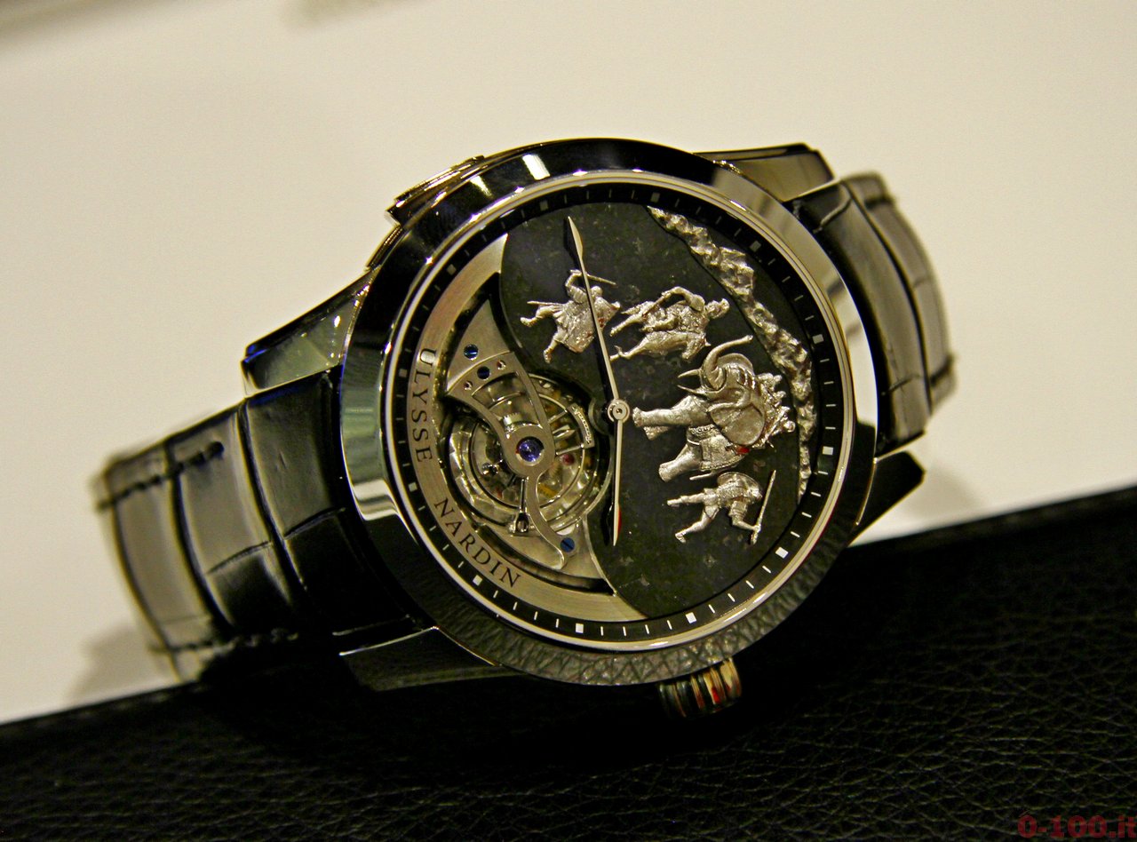 All’interno di una cassa in platino da 44 mm Ulysse Nardin racchiude un esempio sublime di raffinatezza tecnica. Il quadrante, in granito delle Alpi svizzere, raffigura una scena dell’impresa di Annibale: il condottiero cartaginese, in viaggio attraverso le Alpi alla testa dell’esercito verso Roma, è raffigurato in sella a un elefante, affiancato da alcuni guerrieri. Tutte le figure sono in oro bianco cesellato.