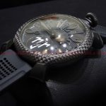 La cassa XXL (48mm x 16mm) è in acciaio AISI 316L con finitura lucida e lunetta in kevlar. L’orologio monta un movimento meccanico a carica manuale Swiss Made (21.600 a/h, 36 ore riserva di marcia, piccoli secondi a ore 6) che si può vedere attraverso il fondello in vetro minerale.