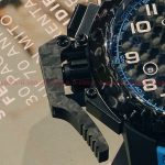 La cassa di questo cronografo Limited Edition (250 pezzi), con pulsanti a bascula rivestiti di gomma gialla, misura generosi 45 millimetri di diametro ed è realizzata in carbonio forgiato e ceramica con inserti in caucciù.