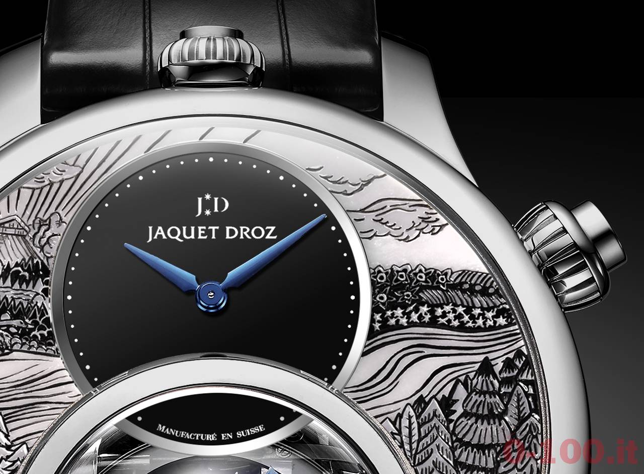 La cassa XXL (47 mm) proposta in oro rosso o bianco 18kt (8 esemplari per ciascuna delle 2 versioni), ospita il calibro Jaquet Droz 615, un movimento meccanico automatico (spirale e anse dell’ancora in silicio, massa oscillante in platino, 21 600 a/h, 38 ore di riserva di carica) per l’indicazione di ore e minuti decentrati in un contatore in onice al 12.