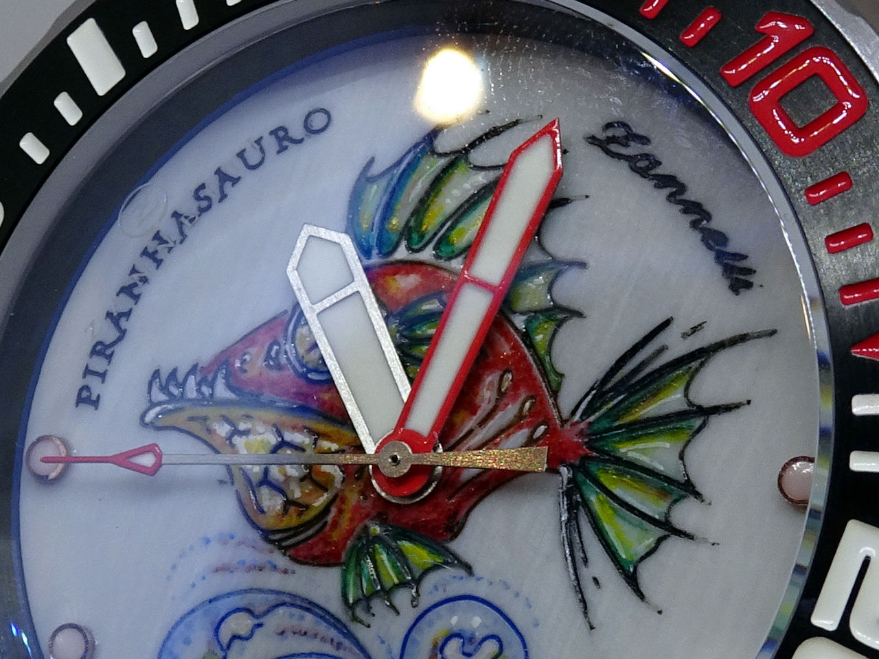 Il quadrante è protetto da vetro zaffiro antigraffio, antiriflesso e spesso 6 millimetri. La lunetta girevole unidirezionale in acciaio spazzolato propone la scala graduata dei 15 minuti in rosso.