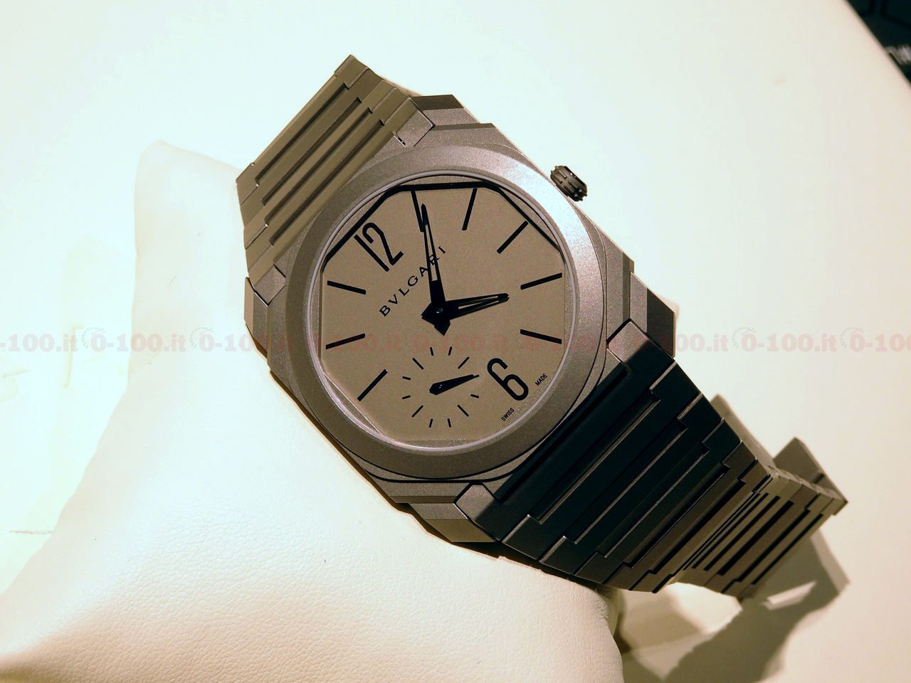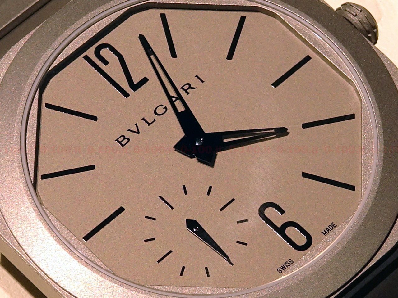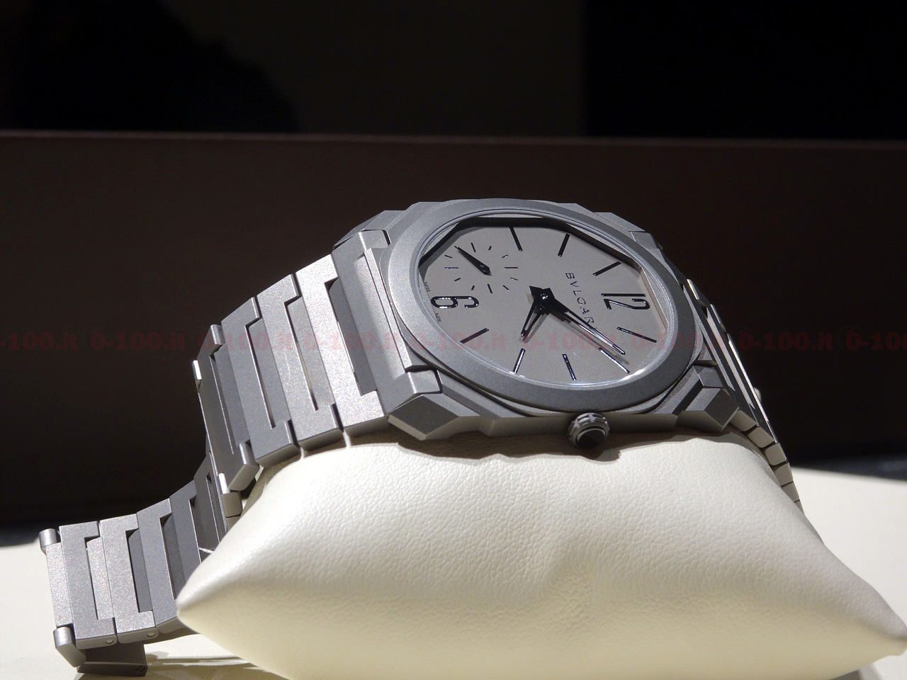 Impermeabile fino a 30 metri, l’Octo Finissimo Automatico ha un quadrante in titanio con indici e lancette nere con trattamento PVD e piccoli secondi decentrati a ore 7.