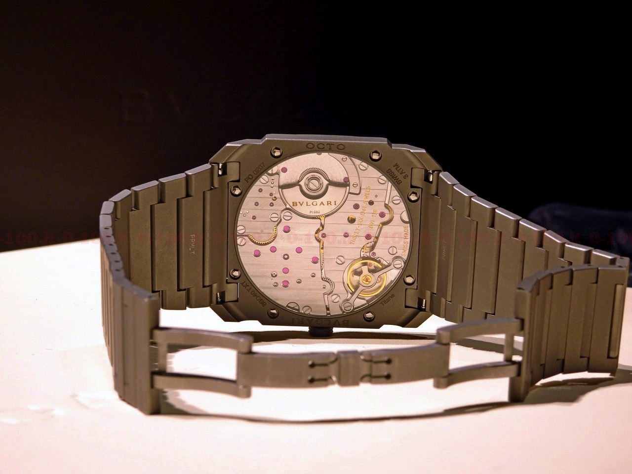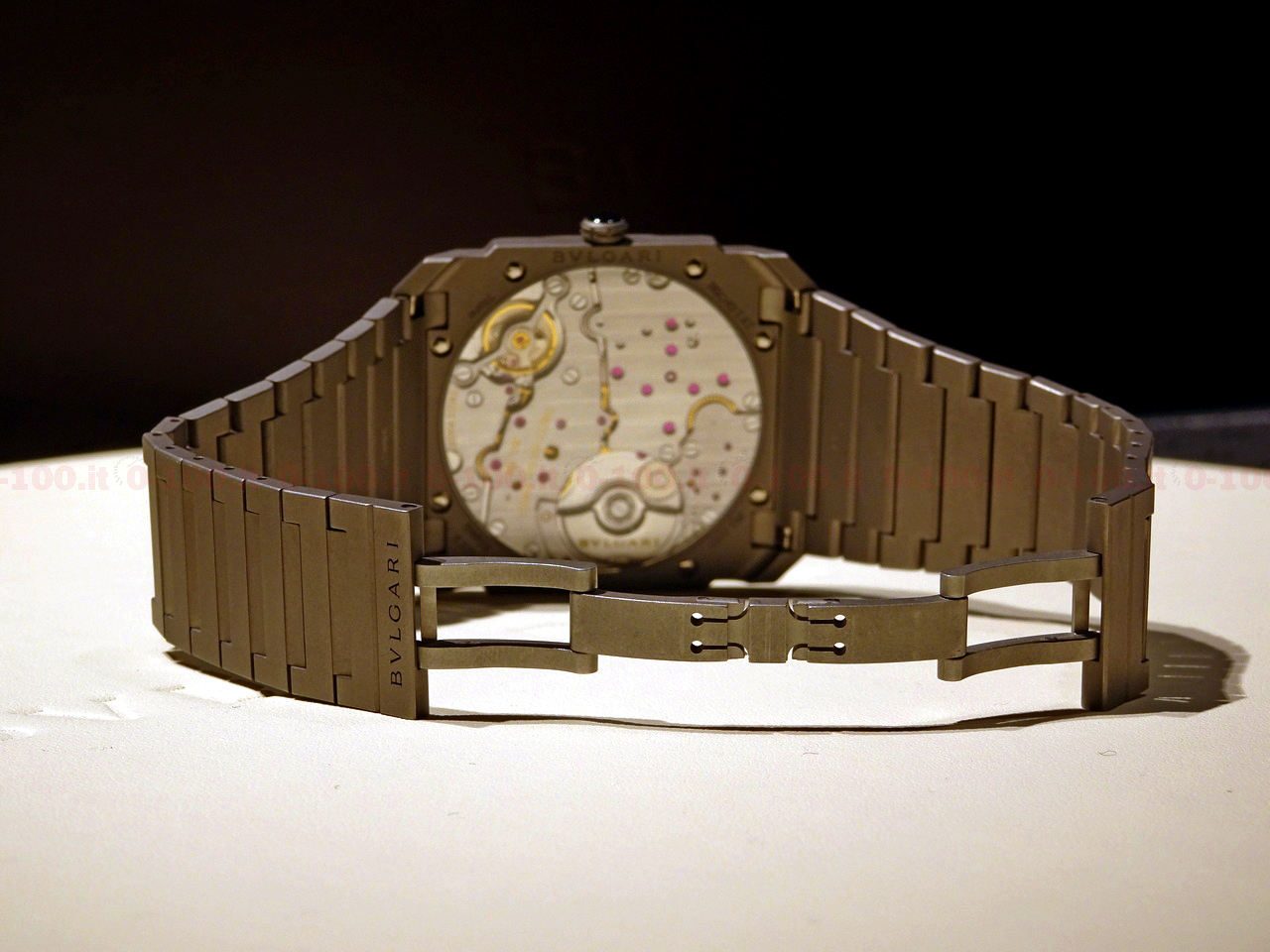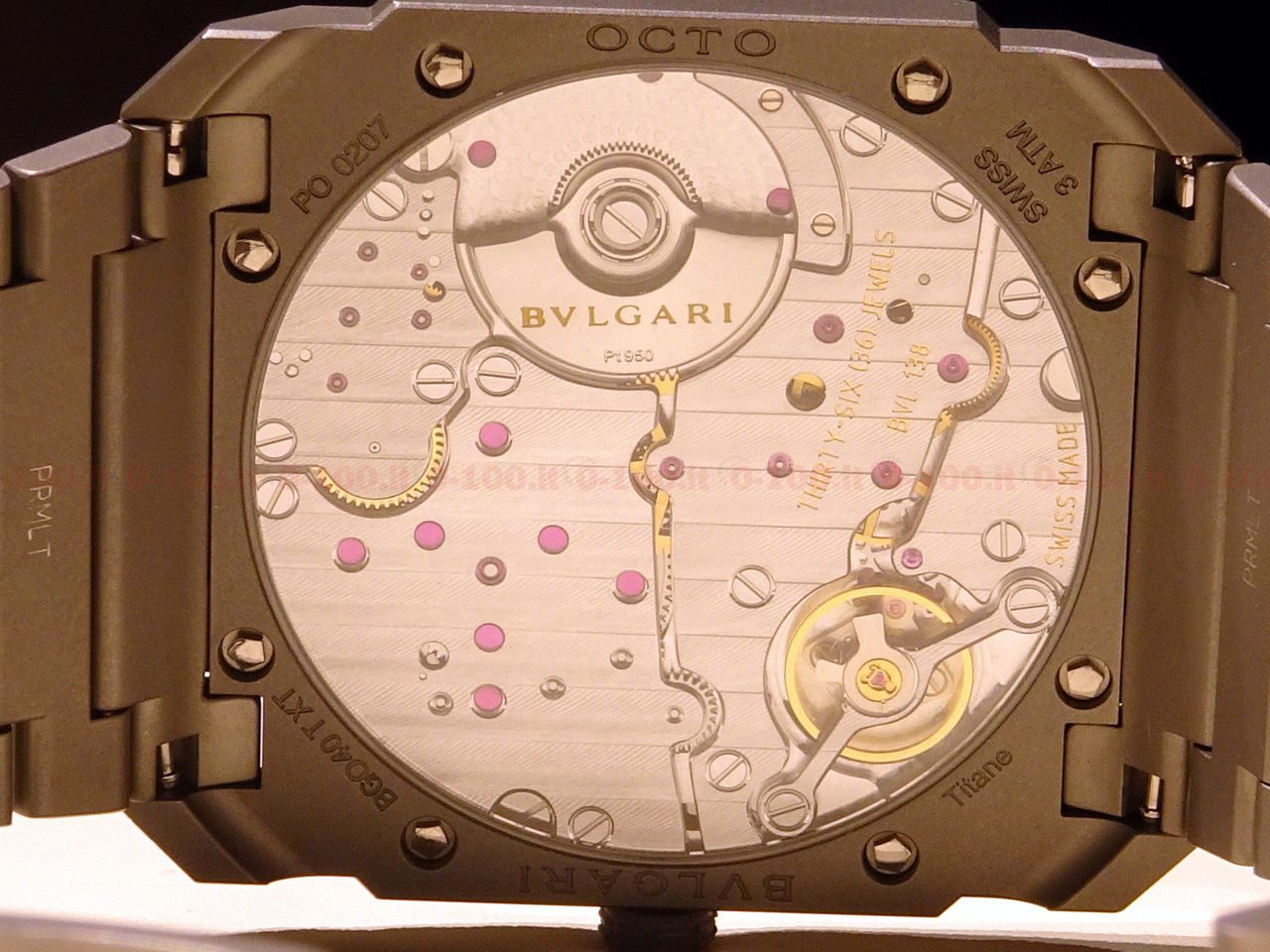 Il calibro BVL 138 Finissimo (2,23 mm) di manifattura e a carica automatica tramite un disco di platino micro-rotore, dispone di platina perlata, ponti smussati e finiture a Côtes de Genève. Pulsa al ritmo di 21.600 alternanze l’ora e assicura una riserva di marcia di 60 ore. Il movimento, visibile attraverso il fondello trasparente, è custodito in una cassa in titanio sabbiato (40 mm x 5,15 mm).