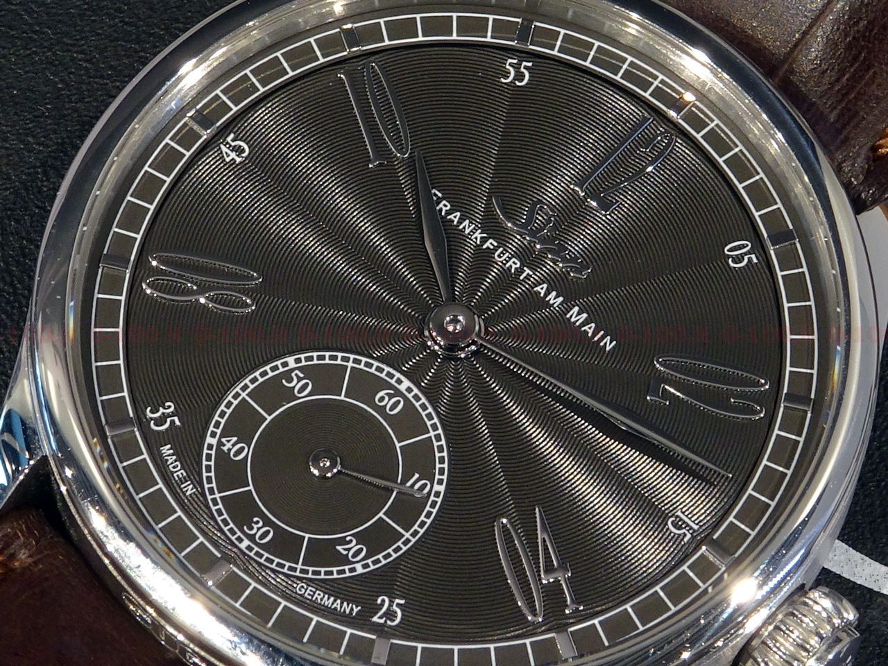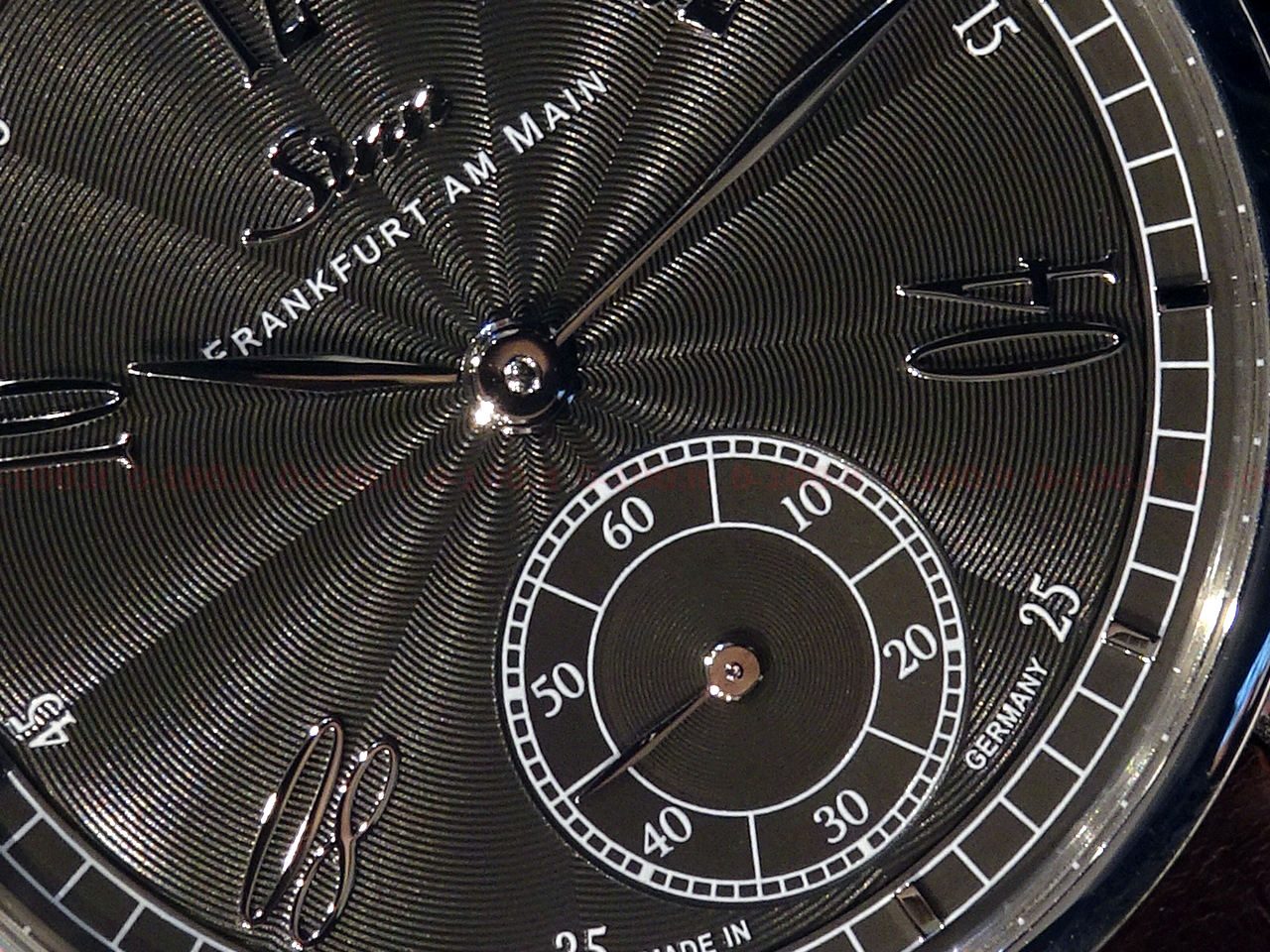 Il quadrante antracite guilloché, protetto da vetro zaffiro antiriflesso ambo i lati, presenta indici e numeri arabi (2, 4, 8 e 10) applicati in oro e, a ore 6, il contatore dei piccoli secondi.