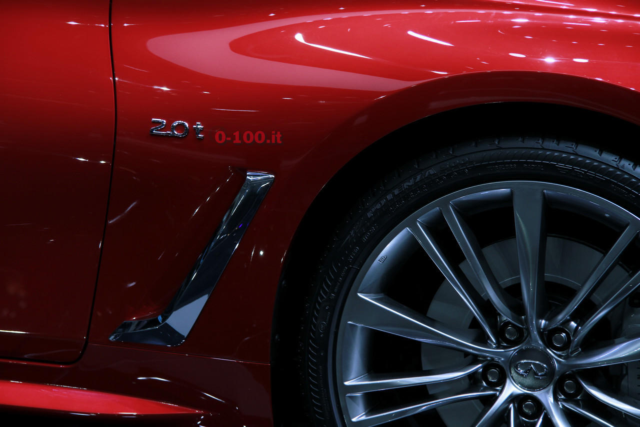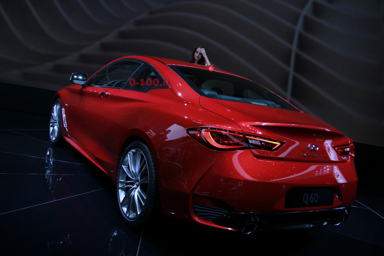 La nuova Infiniti Q60, presentata al NAIAS di Detroit lo scorso gennaio, punta a distrarre i clienti di BMW Serie 4, Audi A5, Lexus RC e Mercedes C-Coupé. Le sue credenziali sono il frontale lungo e caratterizzato da uno stile inconfondibile, marcato dalla surdimensionata calandra trapezoidale inserita in una aggressiva forma a cuneo. Il design sinuoso, filante e sfuggente continua, dopo il possente frontale, lungo la fiancata dove si apprezza l’andamento discendente del montante verso il volume di coda. Qui i fianchi si allargano e dal piccolo baule si propone uno spoilerino conclusivo. Sarà a listino con un “piccolo” motore 4 cilindri in linea di 2 litri, turbo, da 208 Cv e 350 Nm o un più fascinoso 6 cilindri a V di 3 litri biturbo con due livelli di potenza: 300 o 400 Cv. La trasmissione prevede, per tutte, il cambio automatico e la trazione posteriore (per la V6 sarà disponibile la trazione integrale).