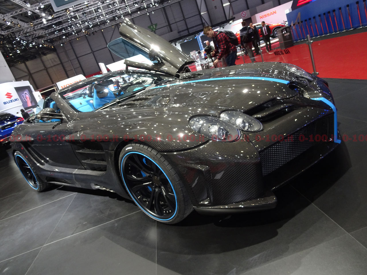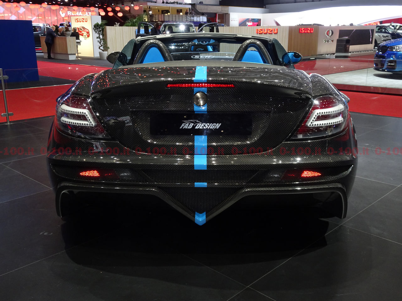 La show car scelta per celebrare l’evento è la FAB Design SLR Desire 20th Anniversary, una SLR realizzata totalmente in fibra di carbonio a vista e dotata di kit estetico che le conferisce un look quasi cartoonesco. Il paraurti anteriore (dotato di due esagerate bocche di aerazione) e quello posteriore (con varie prese d’aria aggiuntive) sono totalmente nuovi. Altre appendici “aerodinamiche” si trovano poco sopra l’arco delle ruote motrici. Gli scarichi, fortunatamente nella stessa posizione dell’originale, aumentano a 3 per lato. I cerchi “Evolution” calzano gomme Michelin in misure 265/30 ZR 20 e 325/25 ZR 20 (fortunatamente quindi non troppo esagerati).