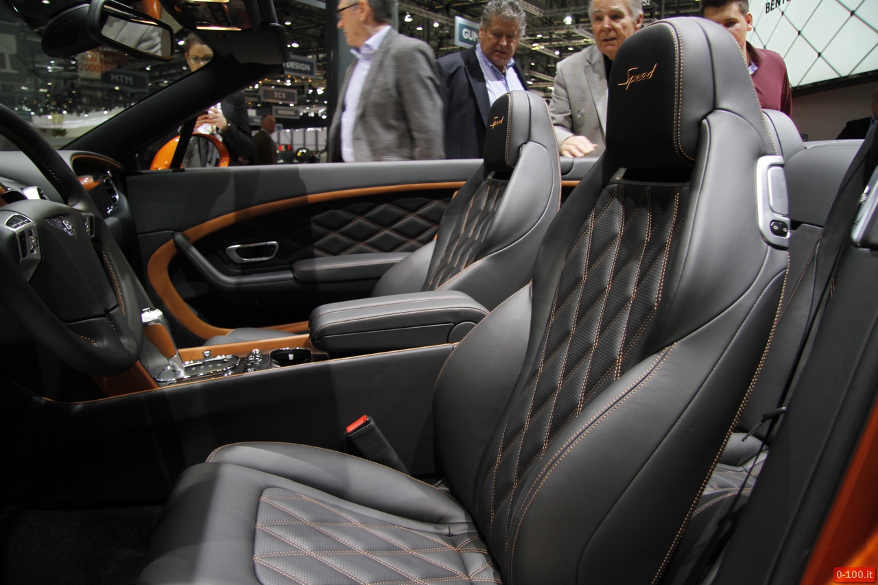 Gli esemplari esposti, in particolare, sia inversione Coupé, sia cabrio, sono contraddistinte dalla plancia con accostamento bicolore della pelle e fibra di carbonio. Quest’ultimo materiale è, probabilmente, anche troppo sportivo anche su un modello così performante (635 Cv, 0-100 in 4″2, 331 km/h). Molto meglio l’alluminio spazzolato che, per altro, era presente sull’esemplare della GT SPEED provato da 0-100.it.