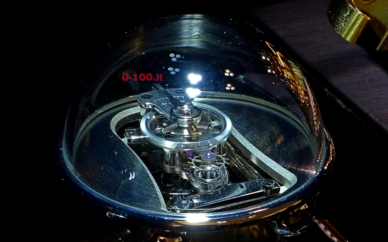 Il segnatempo è equipaggiato con un movimento meccanico a carica automatica a sviluppo 3D (oltre tre anni di sviluppo) con tourbillon volante 60 secondi visibile nella cupola centrale. E’ costituito da 475 componenti, batte al ritmo di 18.000 alternanze l’ora e assicura una riserva di carica di 72 ore.
