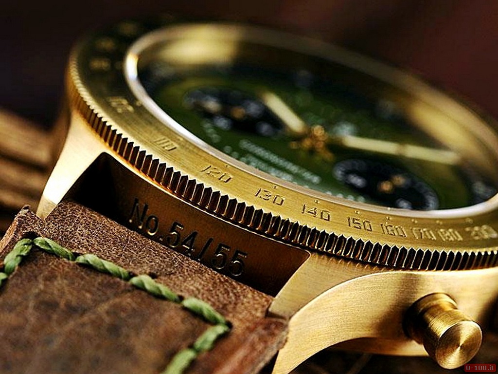 L’orologio, avvolto da una lunetta in bronzo satinato con tachimetro, oltre ai due contatori del cronografo (minuti cronografici alle 9, secondi continui alle 3), fornisce le funzioni di ore e minuti.