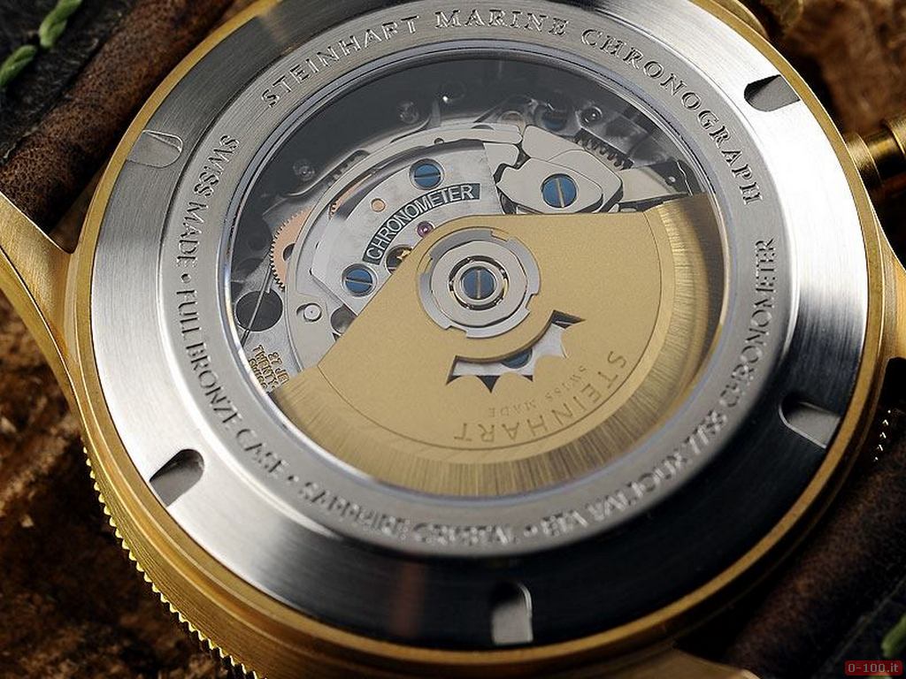 Il movimento, fornito di certificato di cronometro rilasciato dal C.O.S.C., è sviluppato su base ETA Valjoux/7753 TOP, meccanico a carica manuale (25 rubini, Soigné-Finish e rotore di manifattura placcato oro con inciso il logo Steinhart).