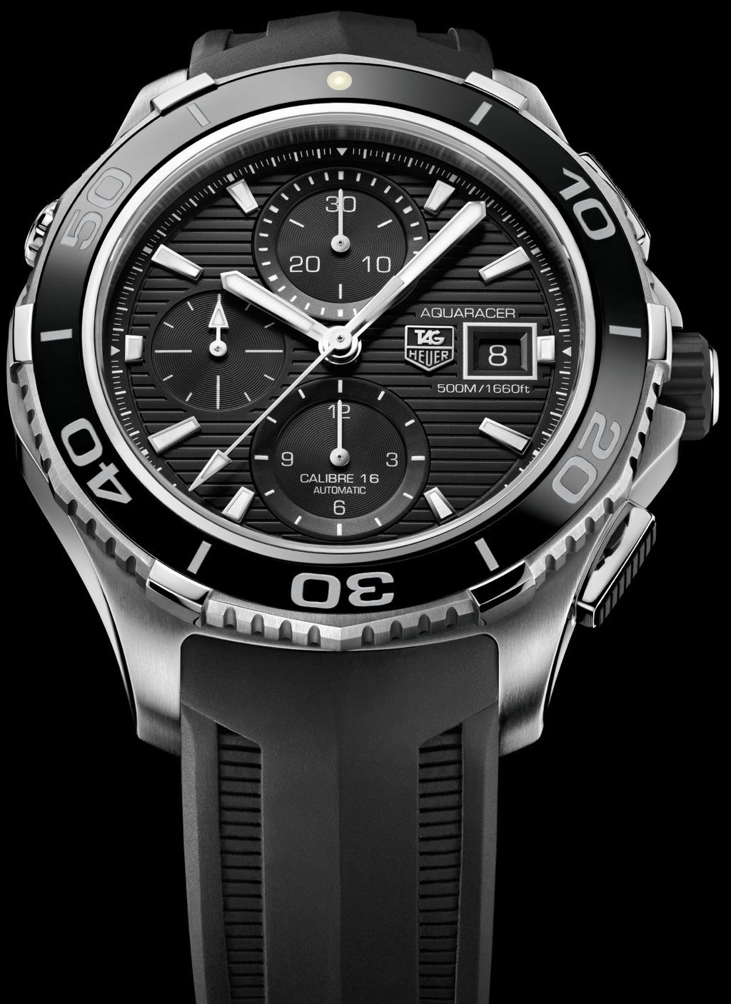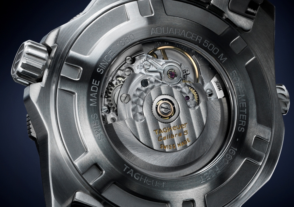 Il TAG Heuer Aquaracer 500M Calibre 16 Chronograph, impermeabile fino a -500 metri, è equipaggiato con movimento svizzero meccanico a carica automatica calibro 16, già utilizzato sui modelli sportivi “automobilistici” della famiglia Carrera. Si caratterizza per la massa oscillante con decorazione Côtes de Genève e riserva di carica di circa 42 ore.