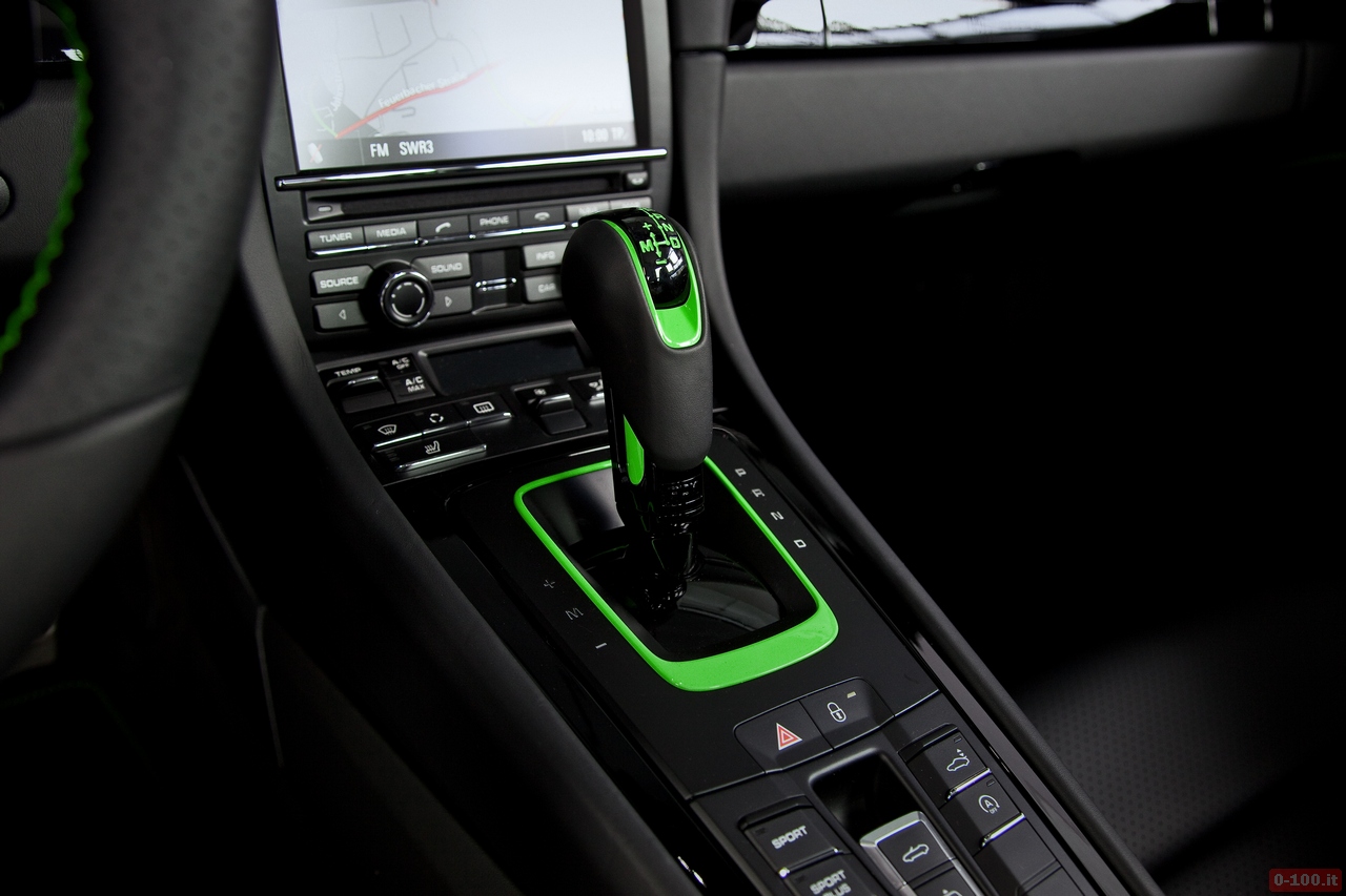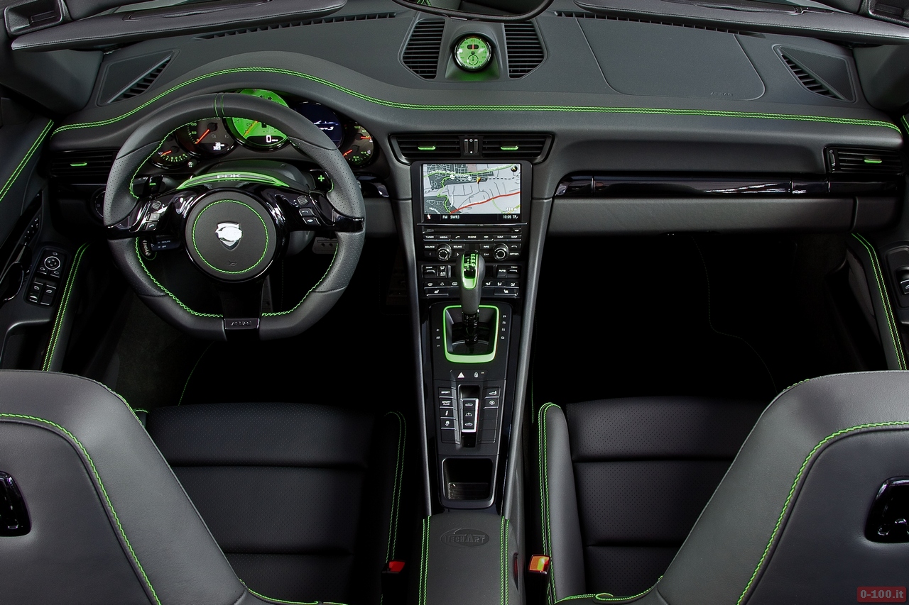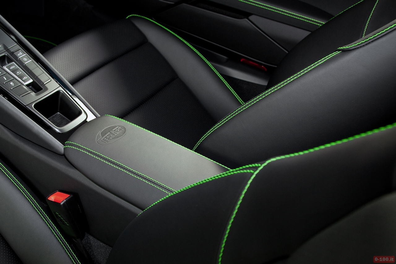 L’interno è completamente rivestito in pelle nera (i sedili sono ulteriormente impreziositi dall’Alcantara sui fianchi) e impreziosito da cuciture a contrasto in tinta Verde Smeraldo. Naturalmente si può optare anche per sedili sportivi con schienale verniciato nello stesso colore verde. Ulteriori personalizzazioni riguardano la strumentazione (pure di colore verde), volante di nuovo disegno, sportello del vano portaoggetti sul tunnel con logo TechArt, placche sul brancardo delle portiere.