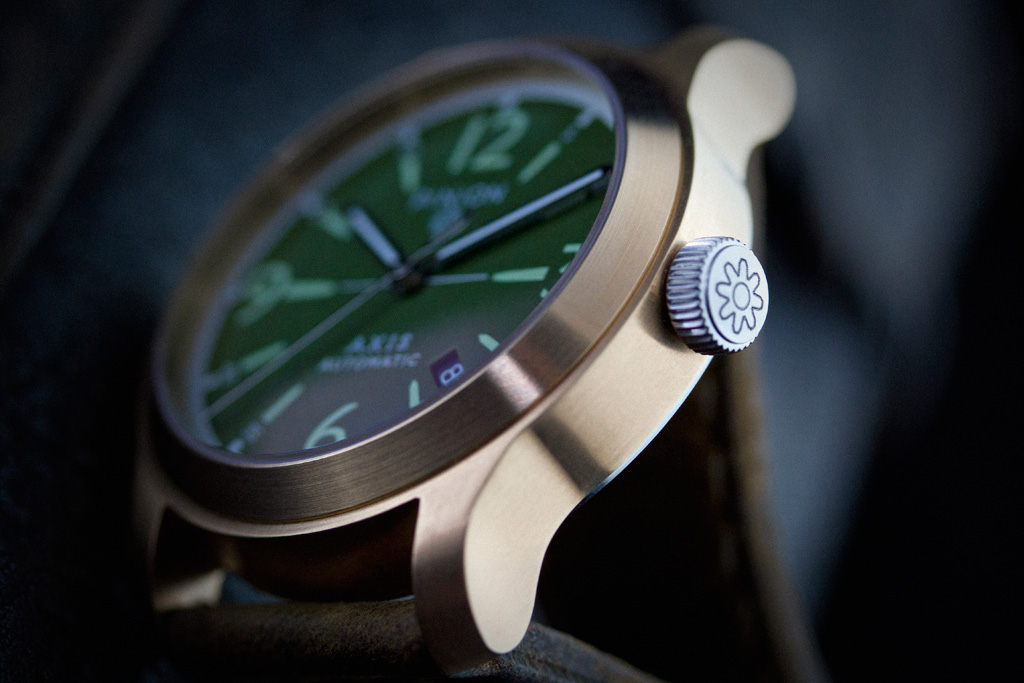 La cassa, dei modelli Axis, misura 42 millimetri di diametro ed è ricavata da un unico blocco di metallo che può essere, a seconda della versione, in acciaio inox satinato, bronzo o, nel più moderno acciaio opaco con rivestimento in DLC nero.