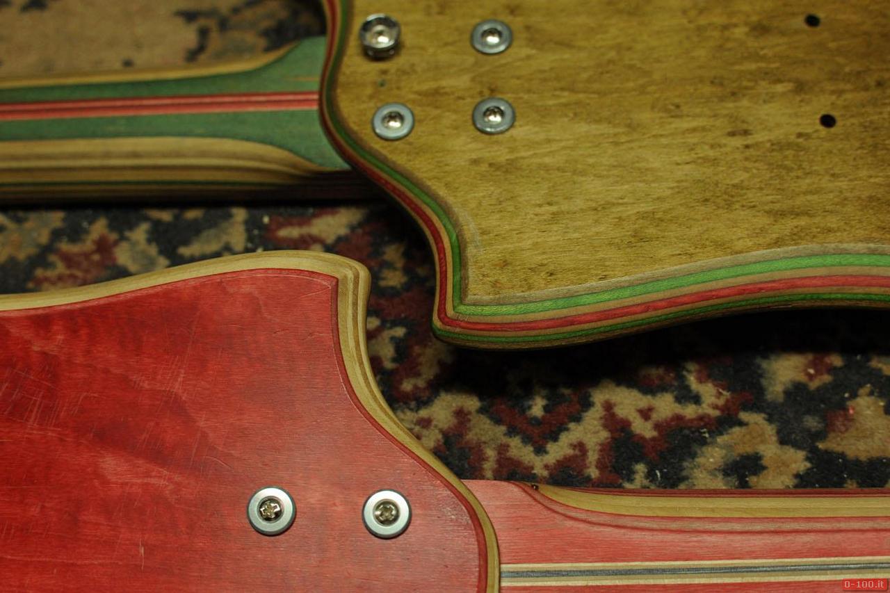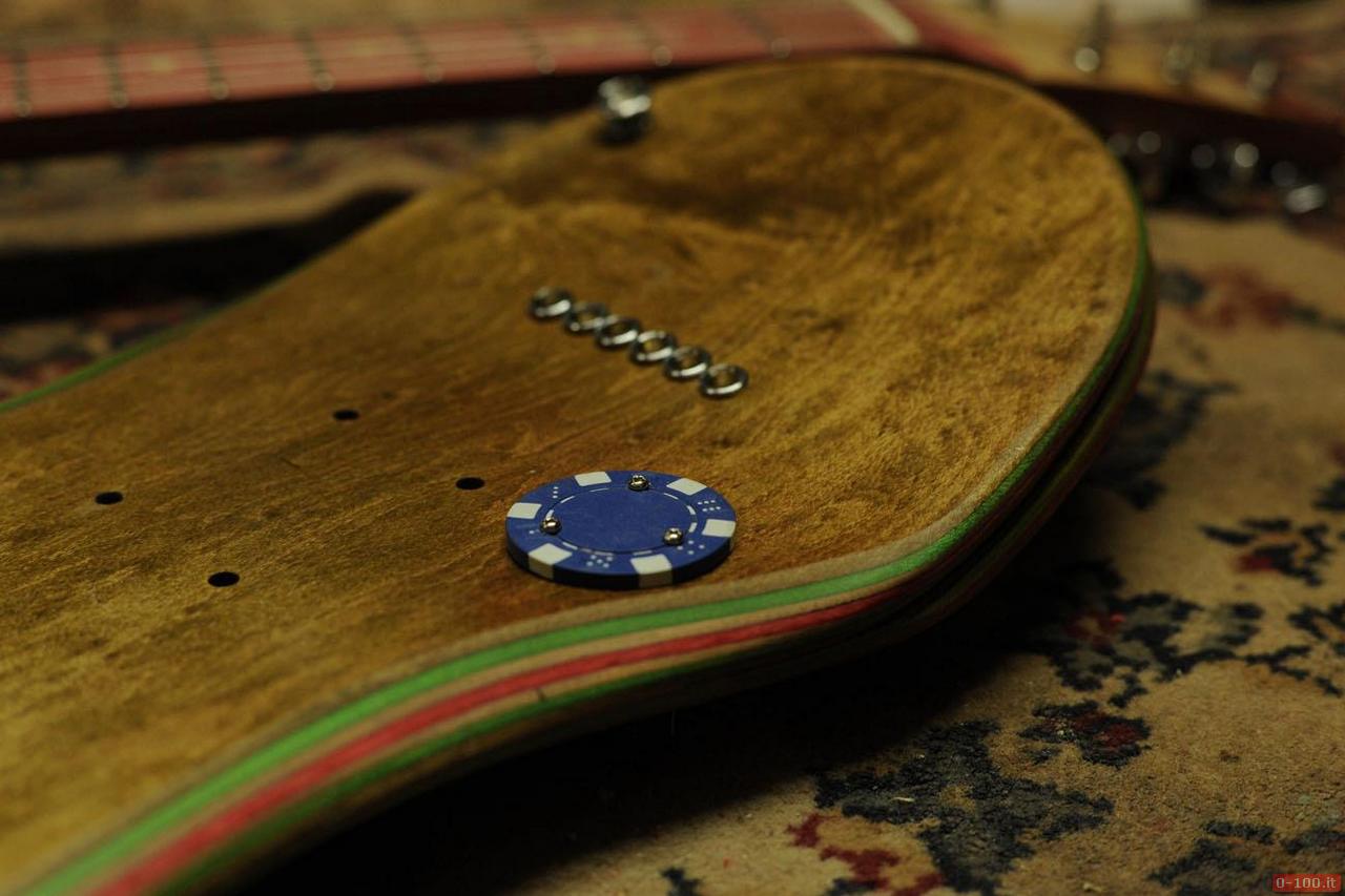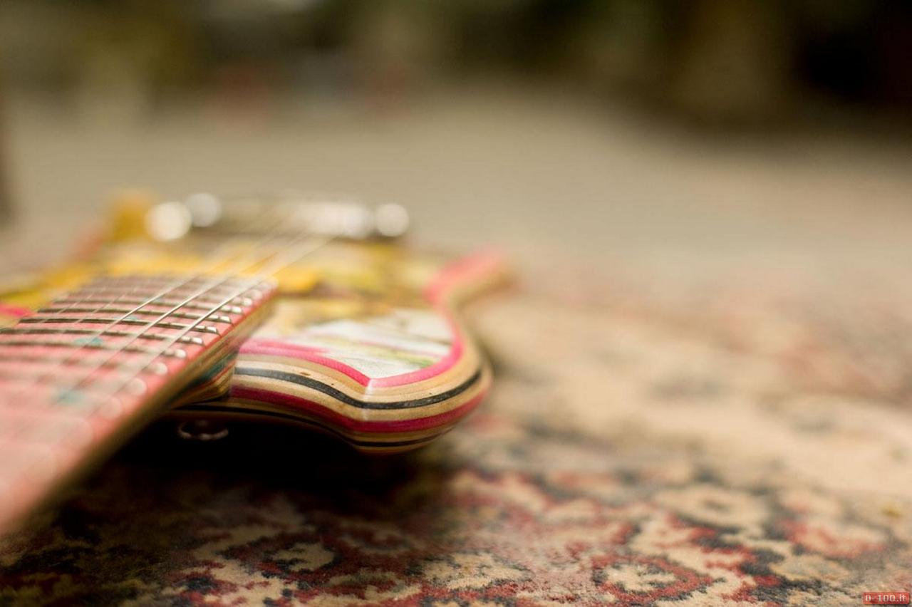 Ciascuna chitarra, con particolari in acciaio, è un pezzo unico realizzato interamente a mano con 2 skateboard di cui uno per il corpo e uno per il collo della chitarra.