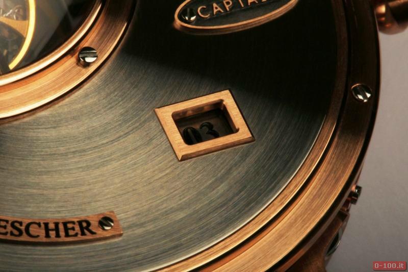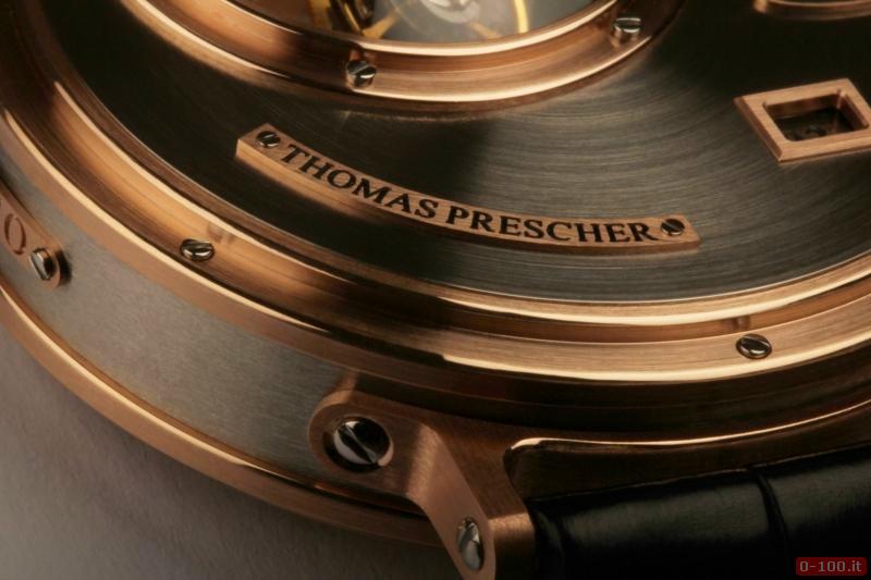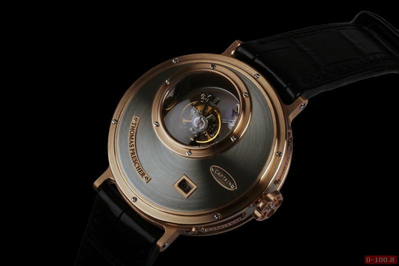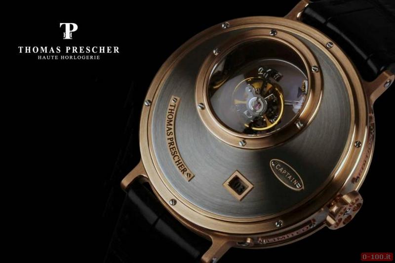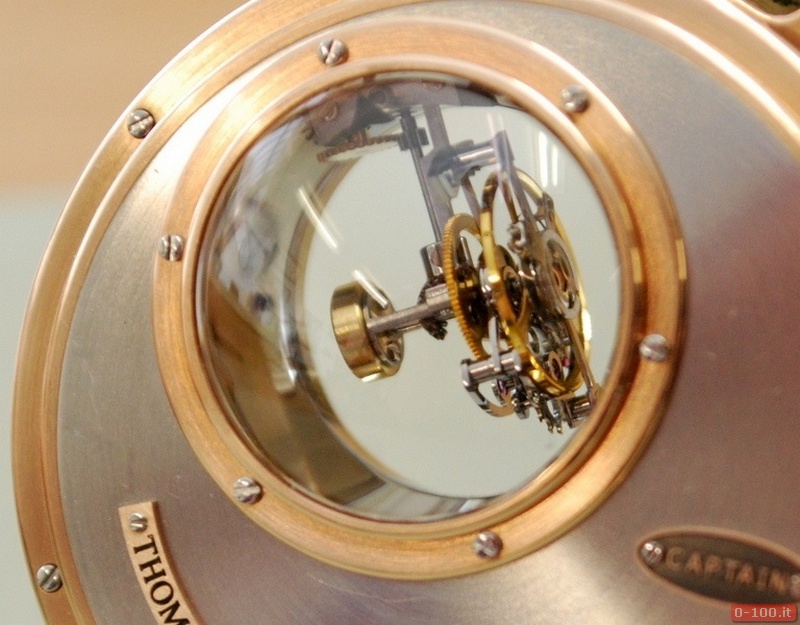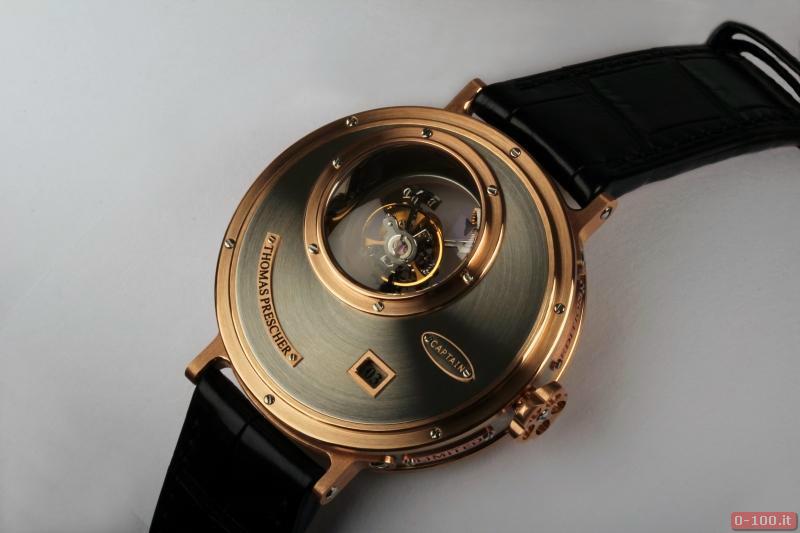 Il Nemo Captain di Thomas Prescher monta il calibro TP 3W6A.3 di manifattura, meccanico a carica manuale (392 componenti, 47 rubini, 21.600 alternanze l’ora, tourbillon volante a tre assi, ore e minuti saltanti, piastre e ponti in ottone placcato oro con finitura guilloché e una riserva di carica di 40 ore).