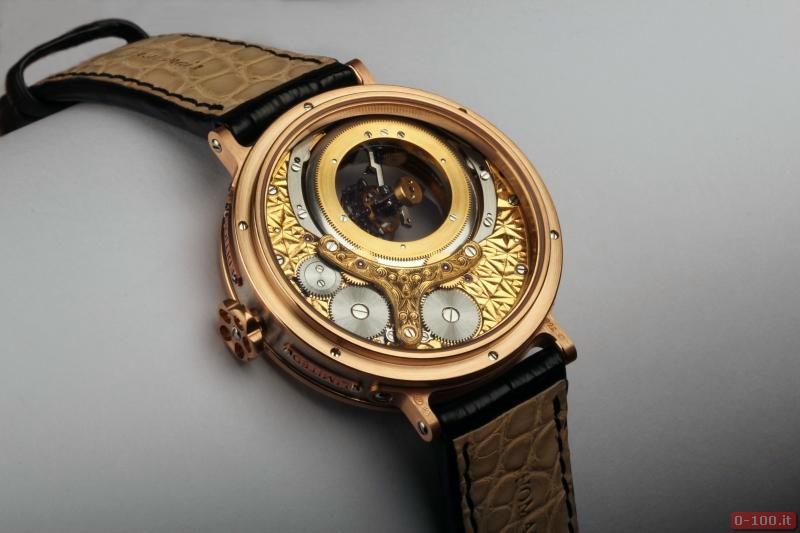 Le anse, le lunette fronte e retro dell’orologio sono in oro rosa 750 (4N) mentre il corpo principale della cassa è in palladio 950.