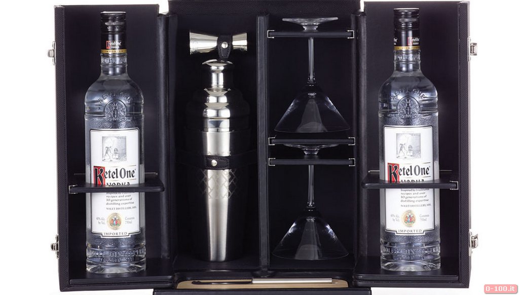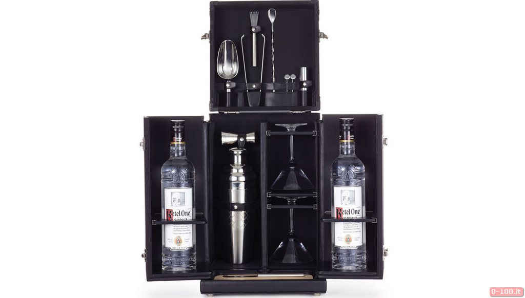 La valigia, in pelle lavorata artigianalmente e con interni in pelle e tessuto antimacchia, è stata progettata in collaborazione con il distributore di liquori Diageo (i cui marchi includono Ketel One e Don Julio) ed è dotata di accessori Barware, i migliori attrezzi per chi ama fare e farsi cocktail di puro piacere sia esso alcolico che analcolico.