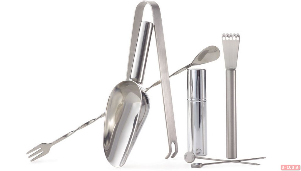 Ogni set si presenta come una valigetta chiusa al cui interno si trovano una vasta gamma di accessori per bar come bicchieri da Martini, uno shaker, uno o due bicchieri dosatori, un Zester, cucchiaio e forchetta, un tagliere in legno e un secchiello per il ghiaccio.