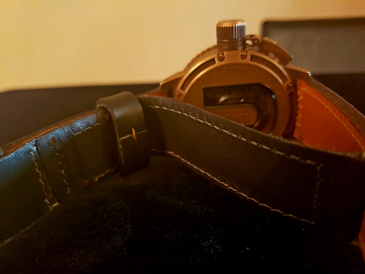 Il cinturino, in cuoio con finitura in cotone cerato, è lavorato a mano secondo una tecnica del 1800 che gli regala un interessante aspetto vissuto. La fibbia ad ardiglione è in bronzo naturale trattato. L’orologio, dal peso di 190 grammi, è proposto al prezzo di 6.500 euro.