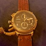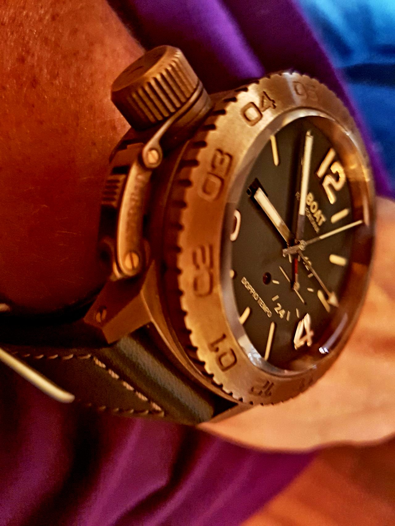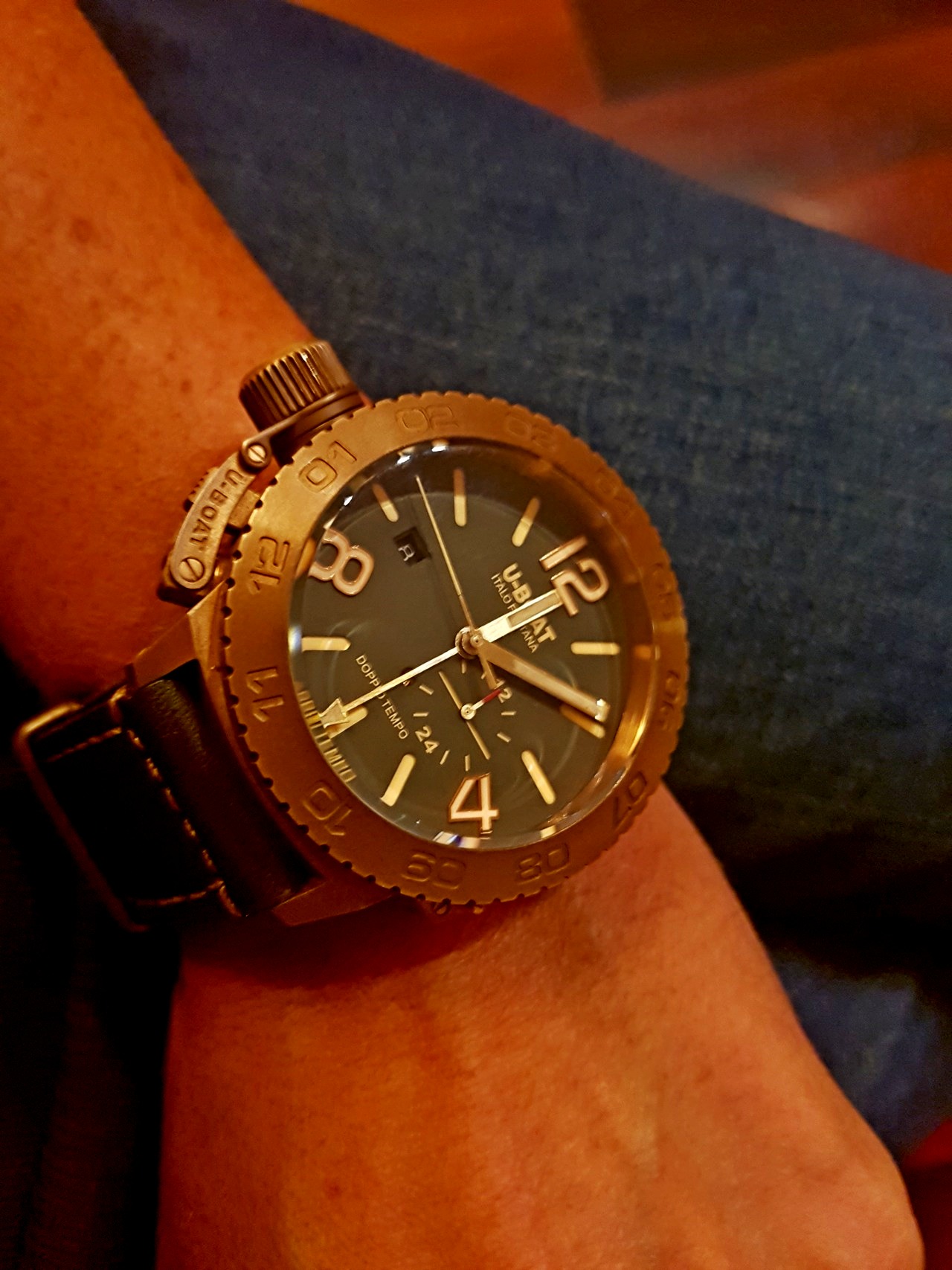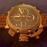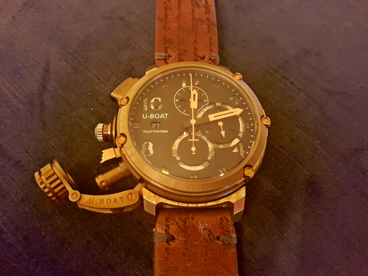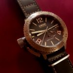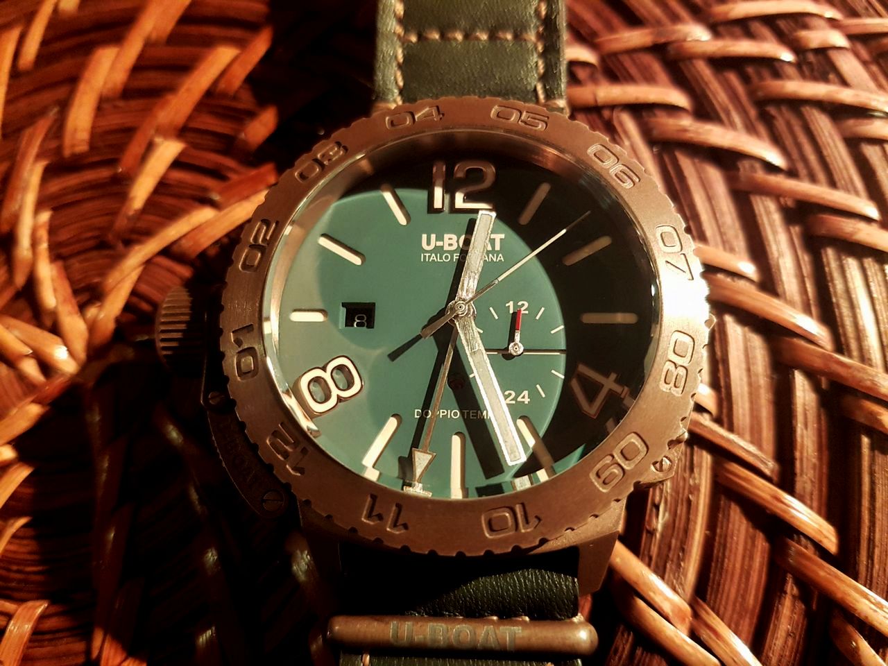 E’ offerto con quadrante verde e marrone e lancette in bronzo spazzolate a mano e trattate con superluminova. Il calibro che lo anima è un meccanico automatico personalizzato U-Boat (base ETA 2824, 28.800 a/h, rotore laserato, 38 ore riserva di marcia, datario, indicatore 24h). Il cinturino è in cuoio lavorato e rifinito a mano con fibbia ad ardiglione in bronzo.