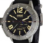 Il modello Sommerso (45mm x 16,60mm, peso 150gr,1.900 euro), impermeabile fino a 300 metri, è caratterizzato da una cassa in acciaio satinato e rifinito a mano con ghiera girevole bidirezionale bloccabile attraverso una leva posta sul lato sinistro (indici calibrati ogni cinque minuti intervallati da numeri ogni dieci che vanno dal 10 al 50). Il display, nero, con numeri arabi e lancette beige trattate con superluminova e con il contatore delle 24 ore, è costituito da tre strati sovrapposti e protetto da vetro zaffiro antiriflesso. E’ mosso da un movimento automatico personalizzato U-Boat su base ETA 2824 (28.800 a/h, 38 ore, ore, minuti, secondi, indicatore 24h, datario). Il cinturino è in gomma con una fodera in pelle di vitello resistente all’acqua grazie al trattamento Kodiak.