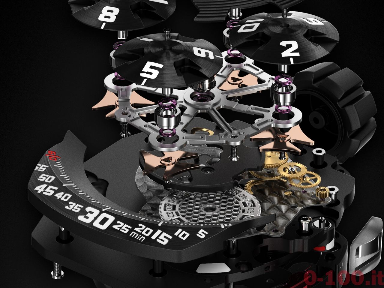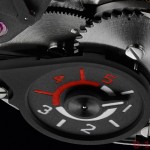 Sul quadrante è presente una calotta in alluminio e PEEK (PolyEtherEthercetone) con aperture da cui spuntano 4 dischi di forma conica che realizzano un movimento orbitale rispetto al centro e al proprio asse. Ognuno di questi riporta un numero, corrispondente all’ora. Questa, posizionata nella parte bassa, slitta indicando i minuti, visualizzati lungo una striscia longitudinale.