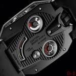 Sul fondello Urwerk ha creato un pannello di controllo che tiene aggiornato l’indossatore su: indicatore per l’aggiunta di lubrificante agli ingranaggi del movimento, indicatore della necessità di un tagliando all’orologio e indicatore della riserva di marcia. Quest’ultima informazione, unitamente ai secondi continui, è visualizzata sulla carrure.