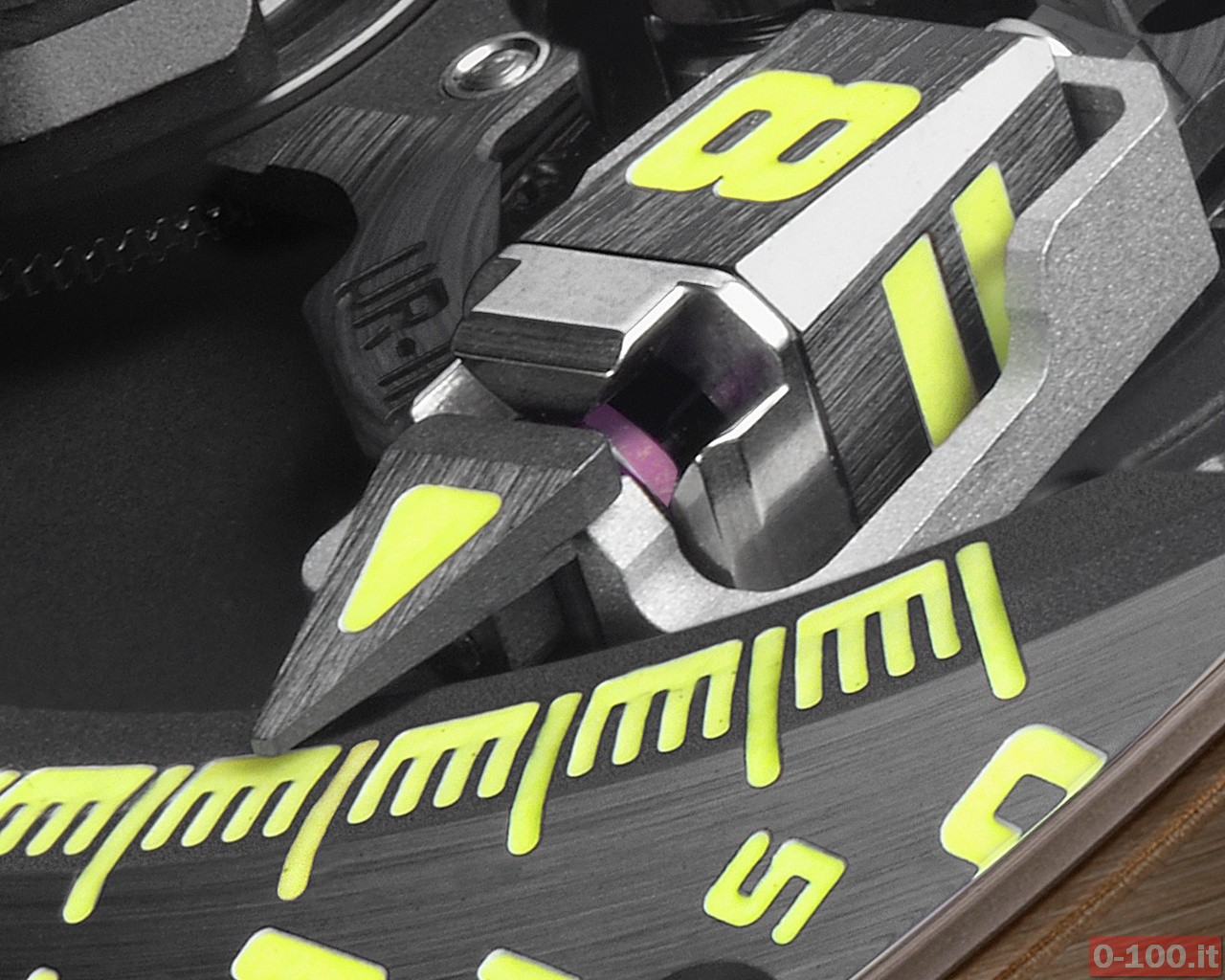 I tre indici che animano il movimento (calibro UR 9.01 a carica automatica) hanno come obiettivo l’arco dei minuti. I tre satelliti mobili, infatti, indicano a fasi alterne, con movimento discendente, una scala verticale graduata posta sulla parte destra del quadrante con l’indicazione da 0 a 60 minuti. L’ingegnosità di questo sistema permette una lettura del tempo completamente inusuale per un orologio meccanico. Il trio, in parallelo, si muove sorvolando la platina andando a scandire lo scorrere del tempo.