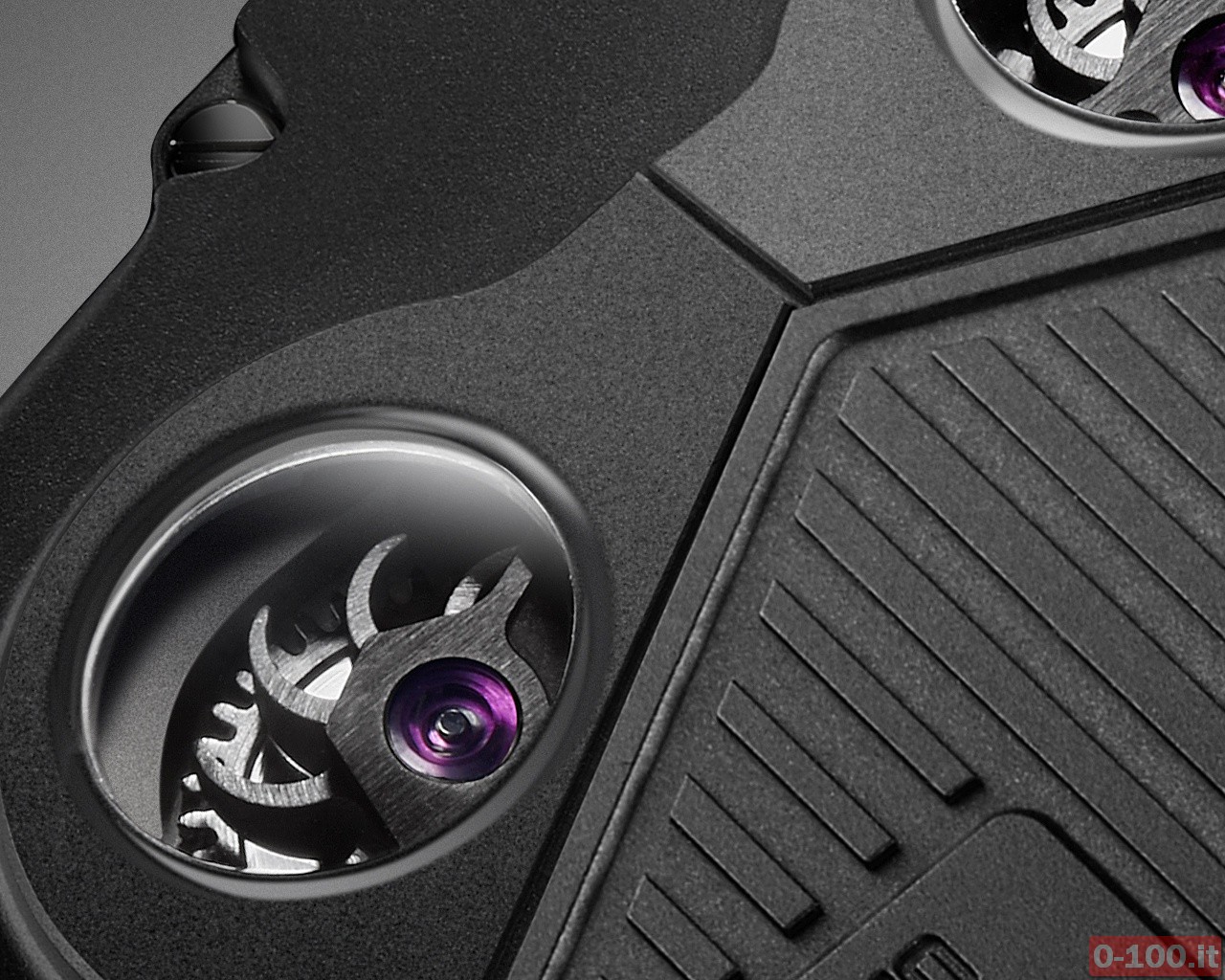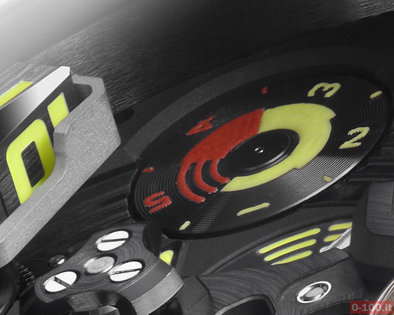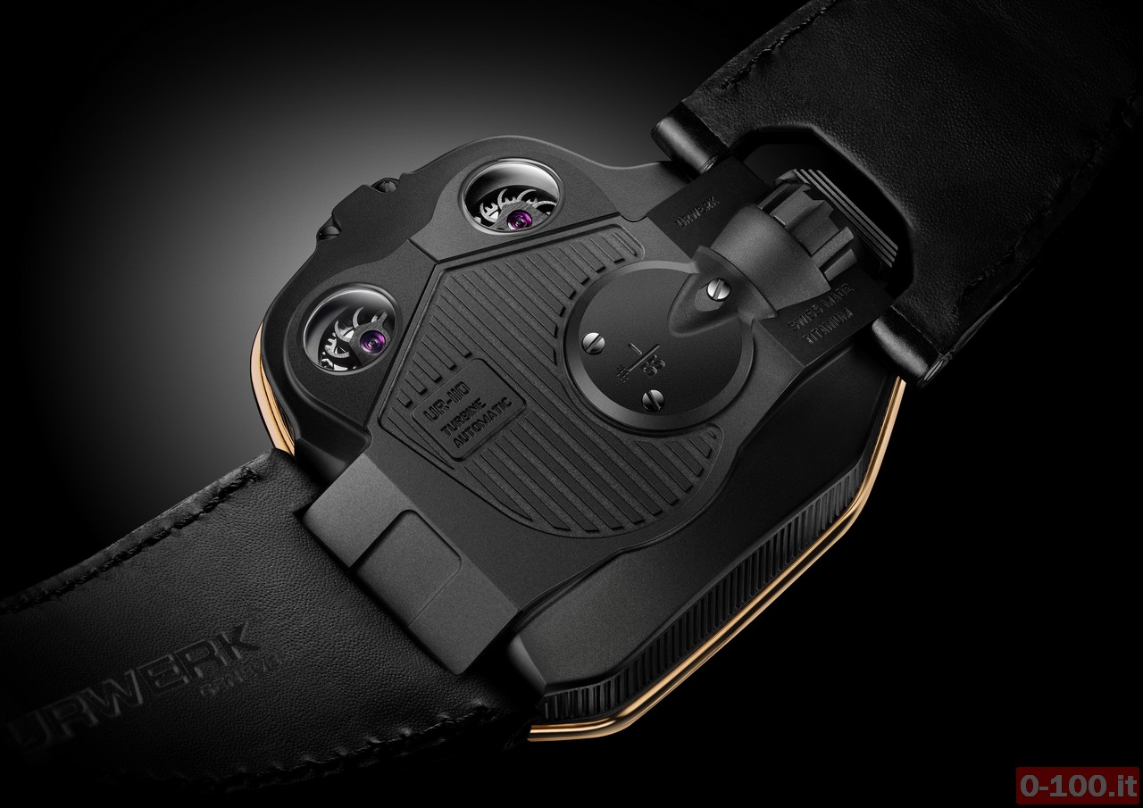 Oltre all’ora, l’Urwerk UR-110 RG visualizza anche: l’indicazione giorno/notte, l’approssimarsi della manutenzione del movimento mediante un meccanismo, sviluppato appositamente da Urwerk, che indica il «cambio olio», e un contatore dei piccoli secondi. Ma non solo: sul fondello in titanio è possibile ammirare l’innovativo sistema di carica automatica regolato da due turbine.