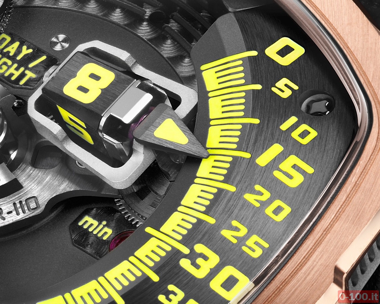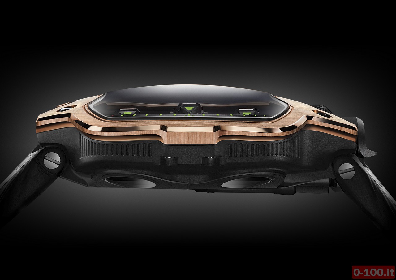 Grande esempio di alta tecnologia orologiera e di un modo innovativo di leggere il tempo, l’Urwerk Ur-110 si veste di preziosità con il nuovo UR 110 RG. La cassa in Titanio Grado 5 (dimensioni: 47mm x 51mm x 16mm) è abbellita da una lunetta in oro rosa (5N). La sconcertante visualizzazione “ore satellitari” del tempo gli ha valso il Grand Prix de l’Horlogerie 2011 nella categoria del migliore design, un riconoscimento che premia la ricerca e la difficoltà raggiunta nella realizzazione tecnica del movimento.