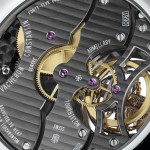Il cuore pulsante è il calibro manuale 1990 di manifattura (ruota di scappamento e leva in silicio con palette in diamante, spirale sferica, finiture a Côte de Genève e satinate soleil) che è custodito “a vista” in una cassa in oro bianco dal diametro di 45,7 millimetri e dallo spessore di 20,06 millimetri. E’ composto da 299 componenti, batte al ritmo di 18.000 alternanze l’ora e assicura un’autonomia di marcia a carica completa di circa 65 ore.