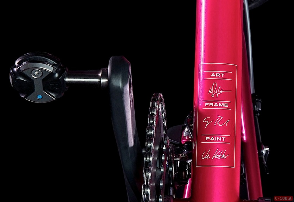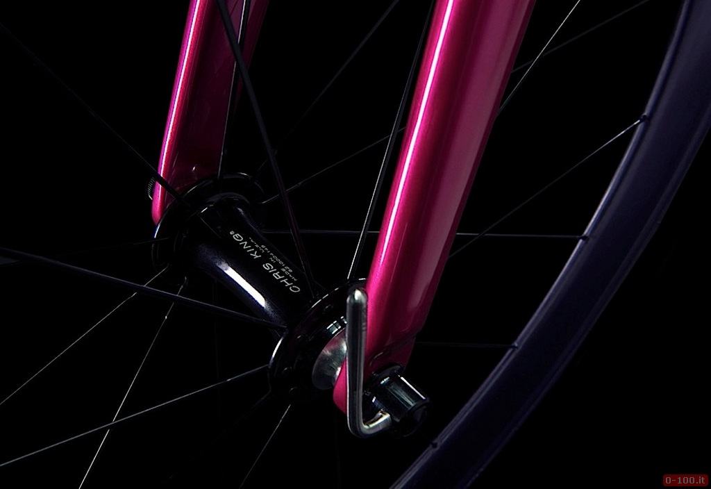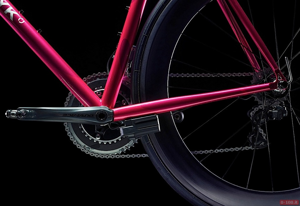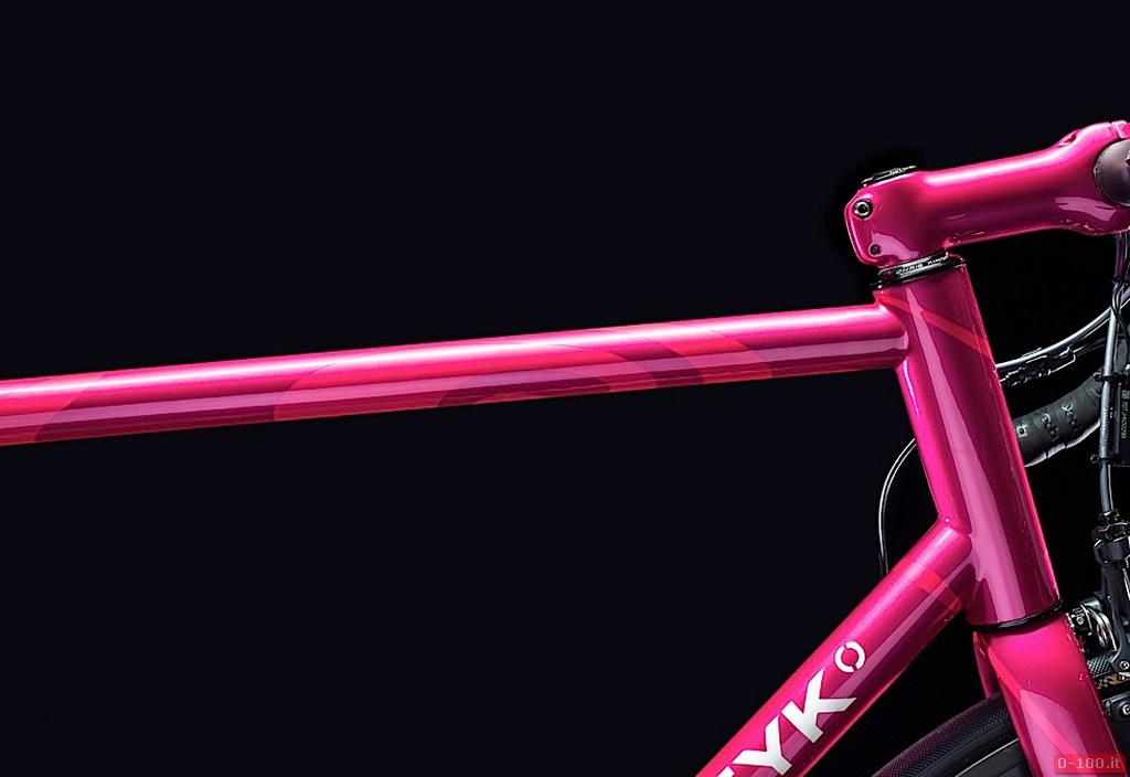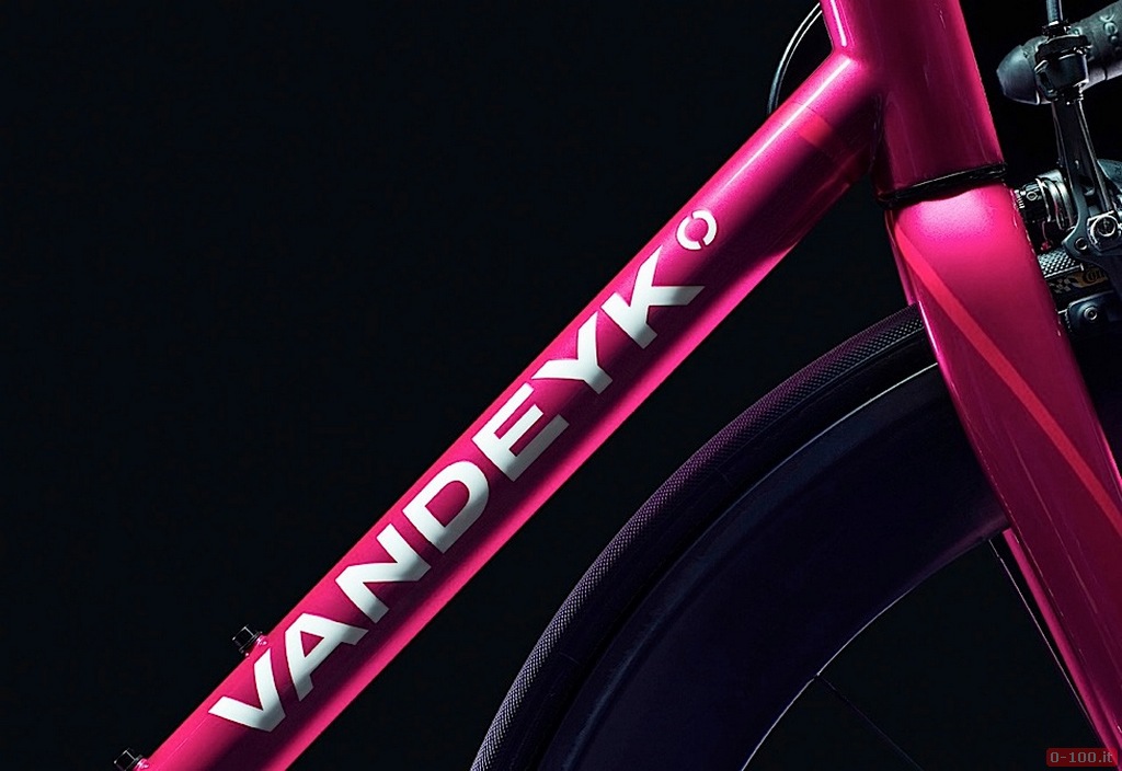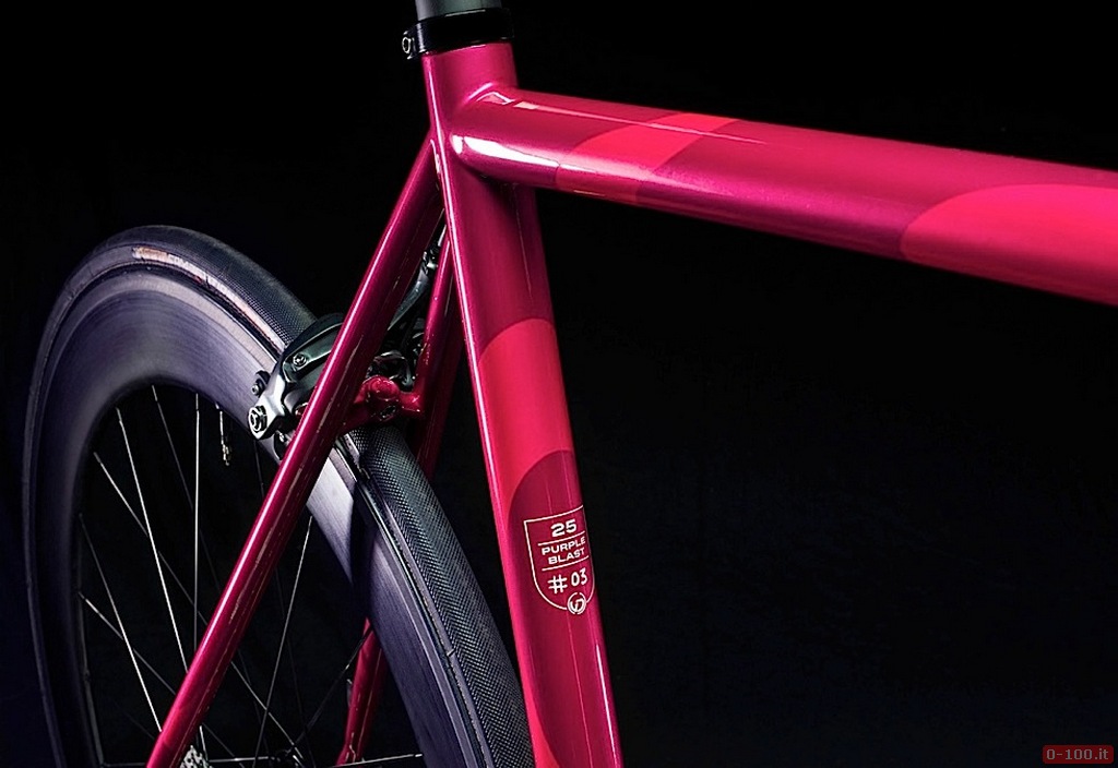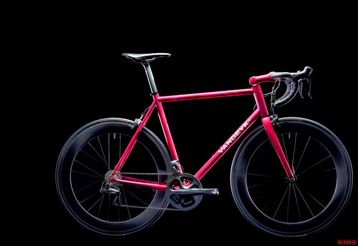 La bicicletta verniciata color porpora è realizzata sulla base di un telaio Vandeyk in acciaio inox Columbus XCr (saldato in TIG), cambio elettronico Shimano Dura-Ace Di2, oltre a componenti di costruttori premium come Chris King o ENVE Composites.