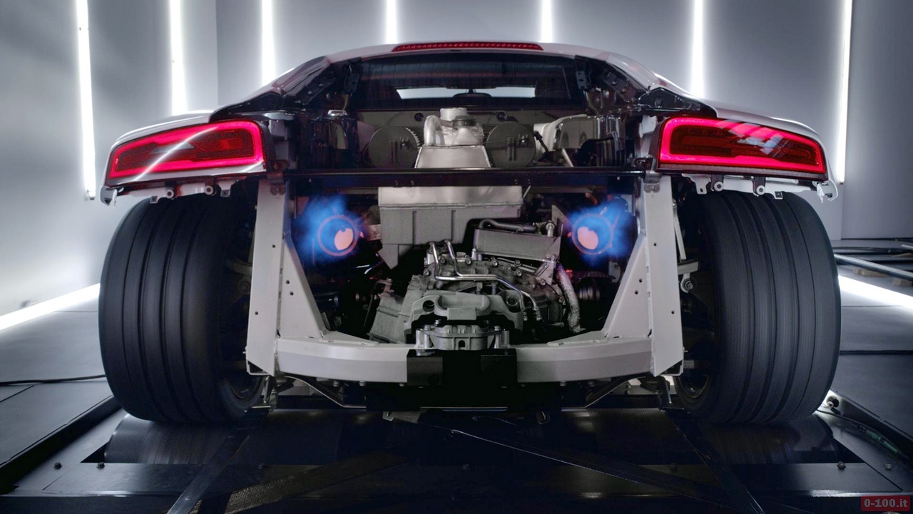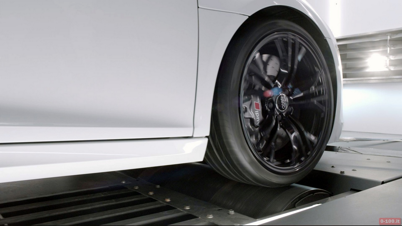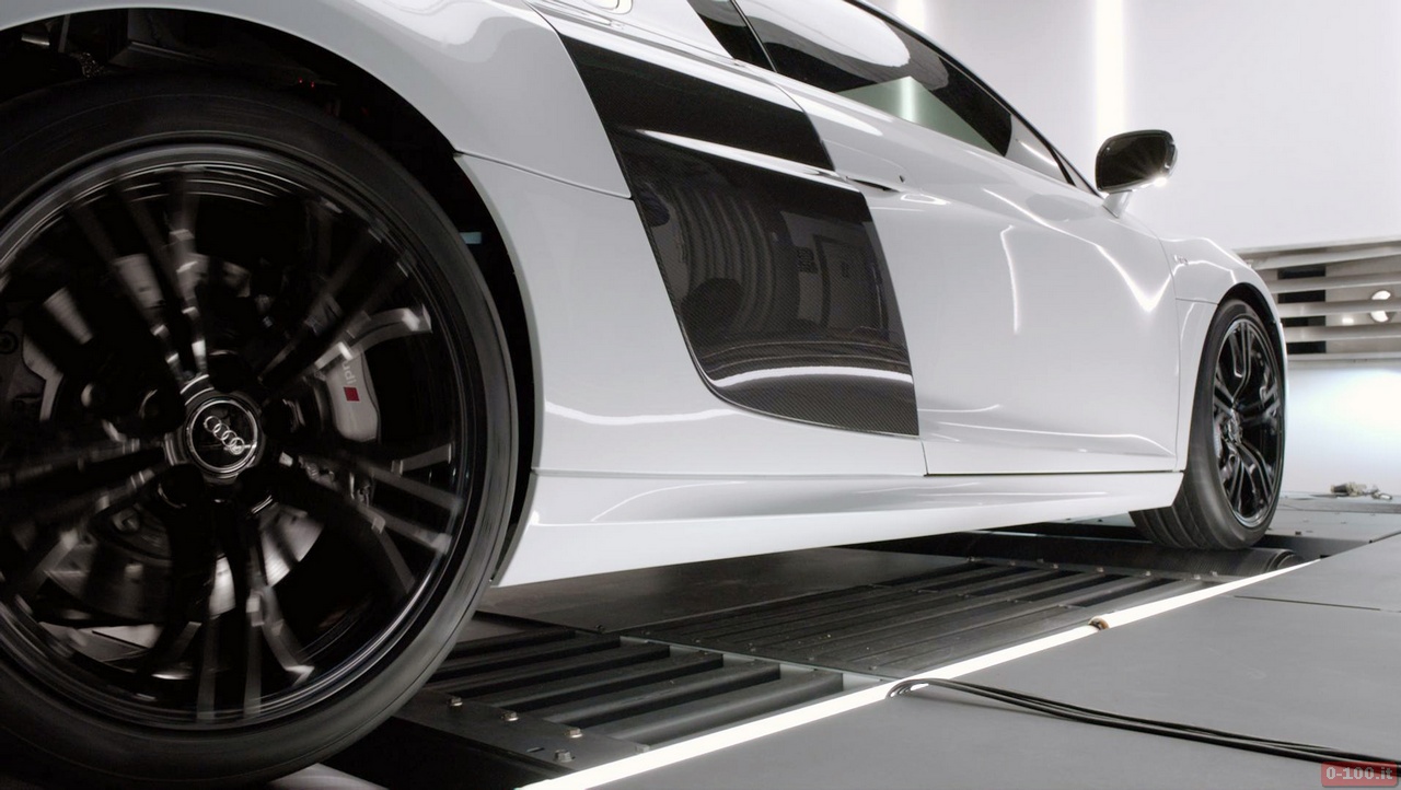 Quindi, mentre è ben ancorata su un banco a rulli, l’R8 da 550 Cv viene lanciata al massimo allo scopo di permettere di assaporare fino all’ultimo decibel tutto il suono possente e indiavolato del 10 cilindri aspirato.