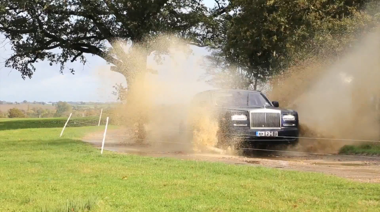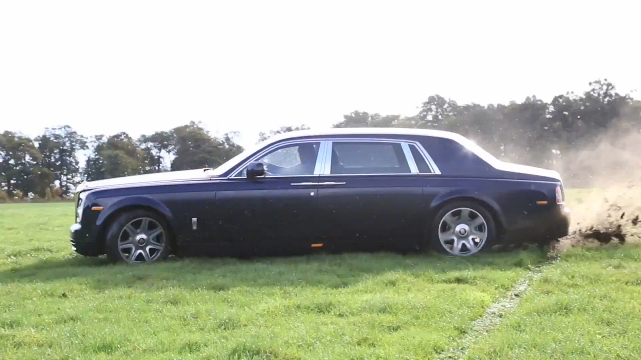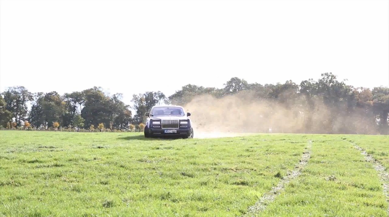 Come una macchina da rally, l’auto più lussuosa del mondo viene condotta senza troppi complimenti in grandiosi traversi insudiciando il suo lussuoso vestito di fango e fili d’erba.