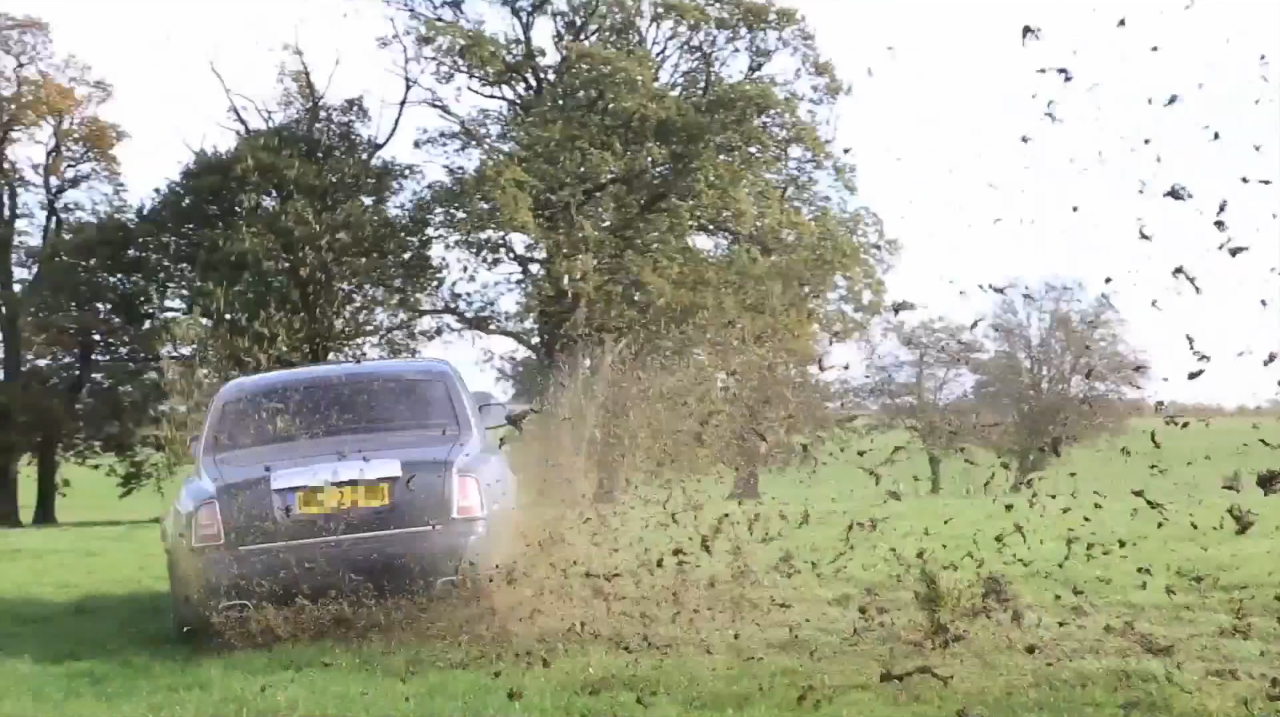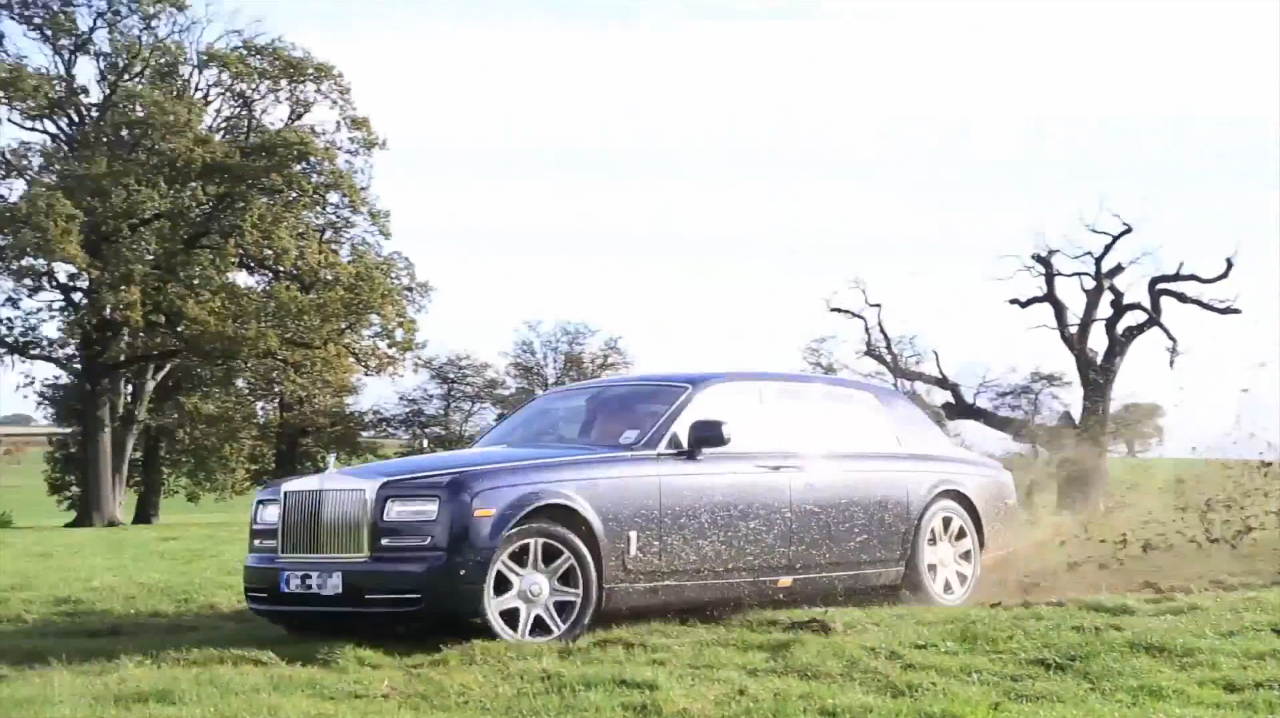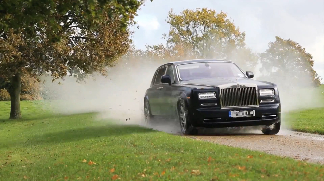 Nel morbido scenario di una campagna inglese, con dolci declivi e sterminati prati di soffice erba verde, una pachidermica Rolls-Royce Phantom danza di traverso tra prati e alberi.