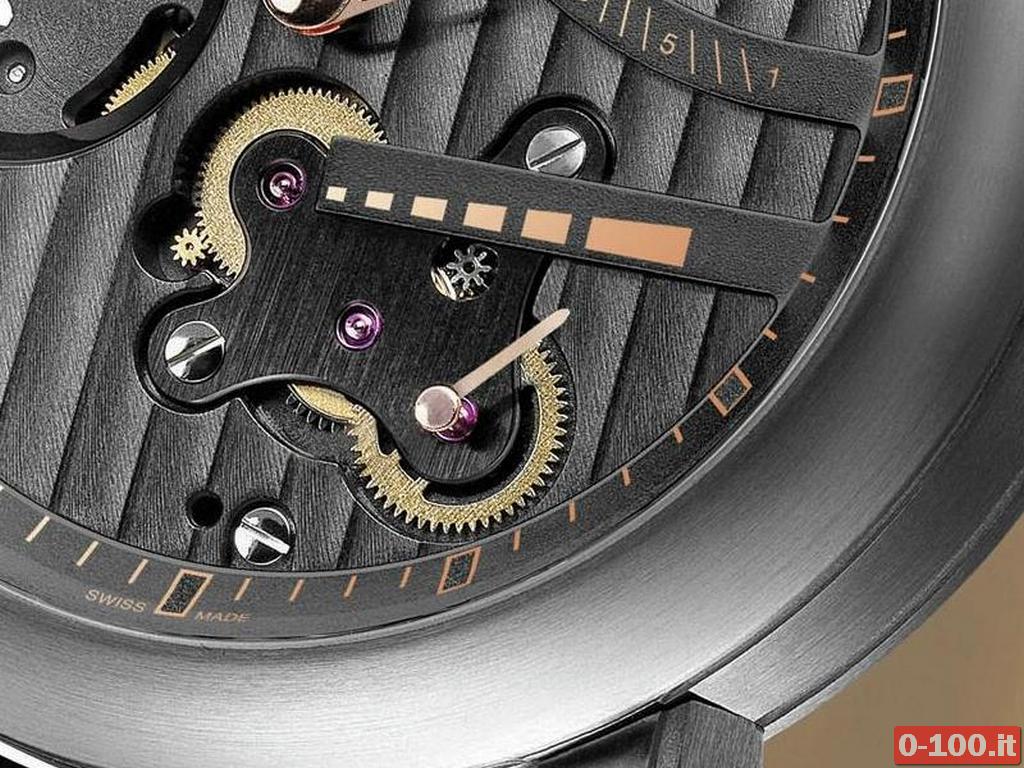 La cassa, in titanio, grado 5, misura 41,5 mm di diametro ed è accoppiata a due vetri in cristallo di zaffiro, lato quadrante e lato fondello per permettere uno sguardo sul movimento. Questo è il calibro Technotime TT738.04, meccanico a carica automatica (con platina lavorata a Cotes de Geneve), equipaggiato con due bariletti di carica per una riserva di marcia complessiva pari a 120 ore (5 giorni).